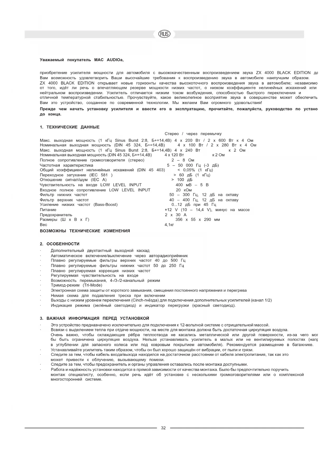 РУКОВОДСТВО ПОЛЬЗОВАТЕЛЯ ZX 4000 MAC AUDIO