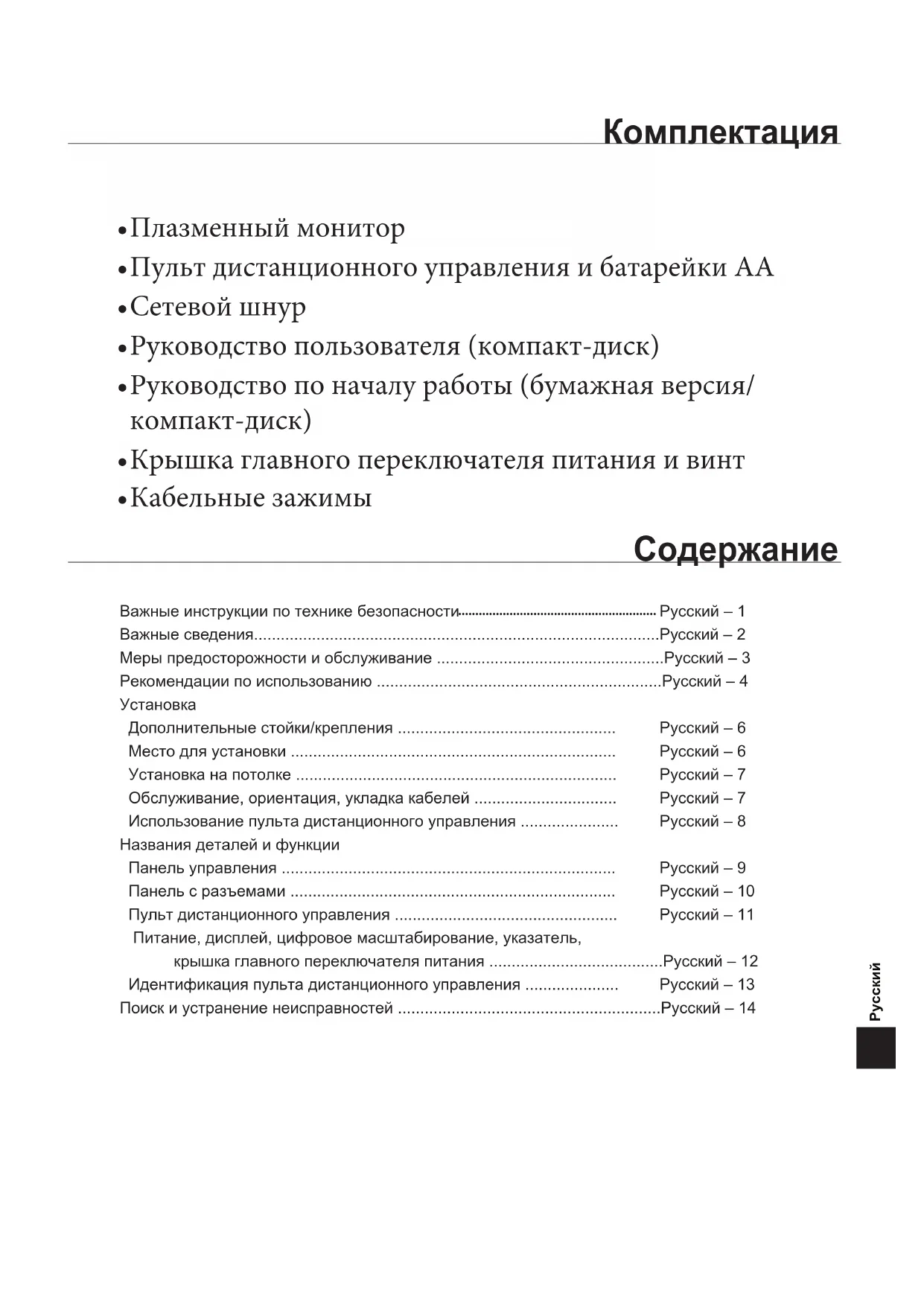 - Комплектация Плазменный монитор Пульт дистанционного управления и батарейки AA Сетевой шнур Руководство пользователя (компакт-диск) Руководство по началу работы (бумажная версия/ компакт-диск) Крышка главного переключателя питания и винт Кабельные зажимы