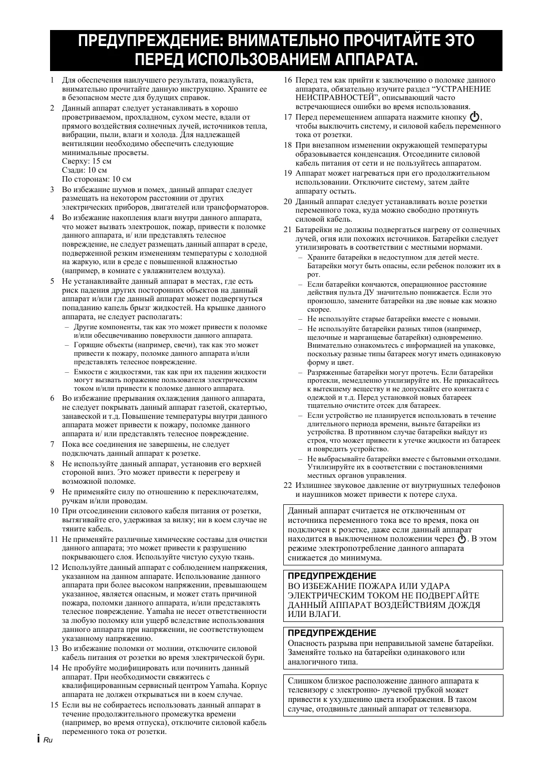 Bluetooth-communicaties hanteren Nederlands Bluetooth “Made for iPod”, “Made for iPhone” en “Made for iPad” betekenen dat een elektronisch accessoire specifiek is ontwikkeld voor aansluiting op respectievelijk iPod, iPhone of iPad en door de ontwikkelaar is gecertificeerd en voldoet aan de prestatienormen van Apple. Apple is niet verantwoordelijk voor de werking van dit apparaat of voor het voldoen aan veiligheidseisen en wettelijke normen. Het gebruik van dit accessoire met iPod, iPhone of iPad kan de prestatie van draadloze functies beïnvloeden. iPad, iPhone, iPod, iPod nano, iPod touch en iTunes zijn handelsmerken van Apple Inc., geregistreerd in de V.S. en andere landen. Español iPod, iPhone, iPad ПРЕДУПРЕЖДЕНИЕ: ВНИМАТЕЛЬНО ПРОЧИТАЙТЕ ЭТО ПЕРЕД ИСПОЛЬЗОВАНИЕМ АППАРАТА. 1 Для обеспечения наилучшего результата, пожалуйста, внимательно прочитайте данную инструкцию. Храните ее в безопасном месте для будущих справок. 2 Данный аппарат следует устанавливать в хорошо проветриваемом, прохладном, сухом месте, вдали от прямого воздействия солнечных лучей, источников тепла, вибрации, пыли, влаги и холода. Для надлежащей вентиляции необходимо обеспечить следующие минимальные просветы. Сверху: 15 см Сзади: 10 см По сторонам: 10 см 3 Во избежание шумов и помех, данный аппарат следует размещать на некотором расстоянии от других электрических приборов, двигателей или трансформаторов. 4 Во избежание накопления влаги внутри данного аппарата, что может вызвать электрошок, пожар, привести к поломке данного аппарата, и/ или представлять телесное повреждение, не следует размещать данный аппарат в среде, подверженной резким изменениям температуры с холодной на жаркую, или в среде с повышенной влажностью (например, в комнате с увлажнителем воздуха). 5 Не устанавливайте данный аппарат в местах, где есть риск падения других посторонних объектов на данный аппарат и/или где данный аппарат может подвергнуться попаданию капель брызг жидкостей. На крышке данного аппарата, не следует располагать: – Другие компоненты, так как это может привести к поломке и/или обесцвечиванию поверхности данного аппарата. – Горящие объекты (например, свечи), так как это может привести к пожару, поломке данного аппарата и/или представлять телесное повреждение. – Емкости с жидкостями, так как при их падении жидкости могут вызвать поражение пользователя электрическим током и/или привести к поломке данного аппарата. 6 Во избежание прерывания охлаждения данного аппарата, не следует покрывать данный аппарат газетой, скатертью, занавеской и т.д. Повышение температуры внутри данного аппарата может привести к пожару, поломке данного аппарата и/ или представлять телесное повреждение. 7 Пока все соединения не завершены, не следует подключать данный аппарат к розетке. 8 Не используйте данный аппарат, установив его верхней стороной вниз. Это может привести к перегреву и возможной поломке. 9 Не применяйте силу по отношению к переключателям, ручкам и/или проводам. 10 При отсоединении силового кабеля питания от розетки, вытягивайте его, удерживая за вилку; ни в коем случае не тяните кабель. 11 Не применяйте различные химические составы для очистки данного аппарата; это может привести к разрушению покрывающего слоя. Используйте чистую сухую ткань. 12 Используйте данный аппарат с соблюдением напряжения, указанном на данном аппарате. Использование данного аппарата при более высоком напряжении, превышающем указанное, является опасным, и может стать причиной пожара, поломки данного аппарата, и/или представлять телесное повреждение. Yamaha не несет ответственности за любую поломку или ущерб вследс