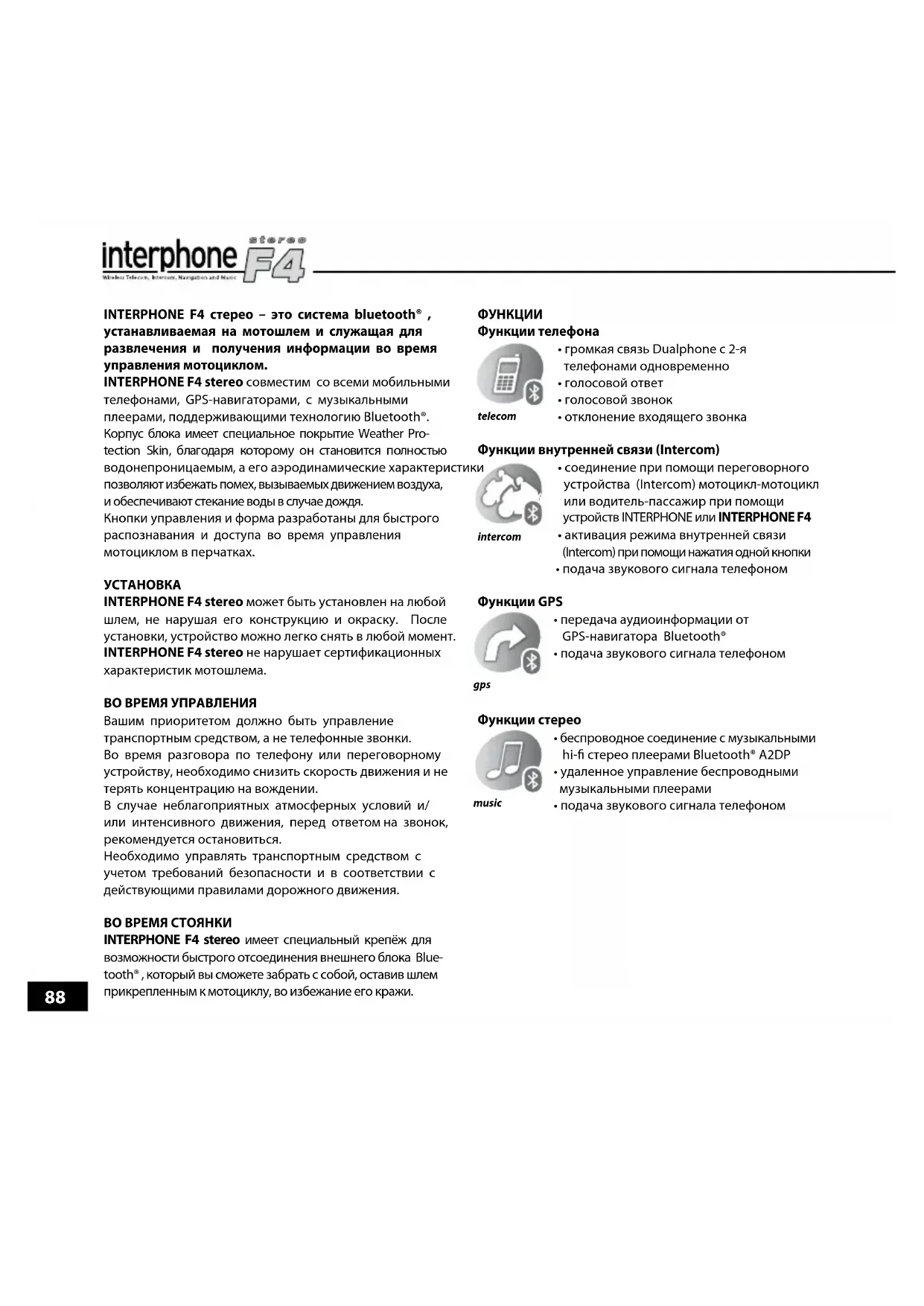 INTERPHONE F4 stereo COBMeTUM CO BCEMN MOBnHbIMN TelefoHaMn, GPS-HaBnRaTopaMn, C My3bKaIbHbIMN nleepaMn, NopdepKnBaOuMn TexHONrIO Bluetooth®.