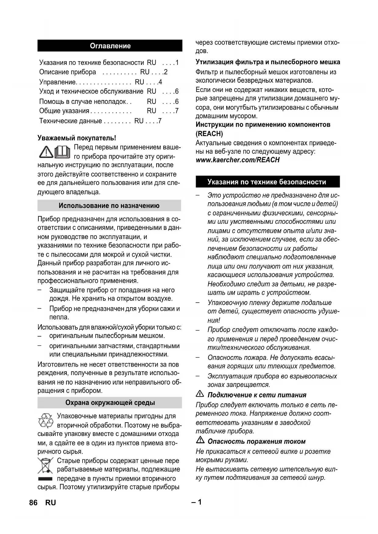- RU Использование по назначению Охрана окружающей среды Утилизация фильтра и пылесборного мешка Указания по технике безопасности 86 RU– 2 Перед началом работы с прибором проверять сетевой шнур и штепсельную вилку на пов- реждения. Поврежденный сетевой шнур дол- жен быть незамадлительно заменен уполномоченной службой сервисного обслужи- вания/специалистом-электриком. Во избежание несчастных случаев, связанных с электричеством, мы рекомендуем использо- вание розеток с предвключенным устройс- твом защиты от тока повреждения (макс. номинальная сила тока срабатывания: 30 мА). p. 7