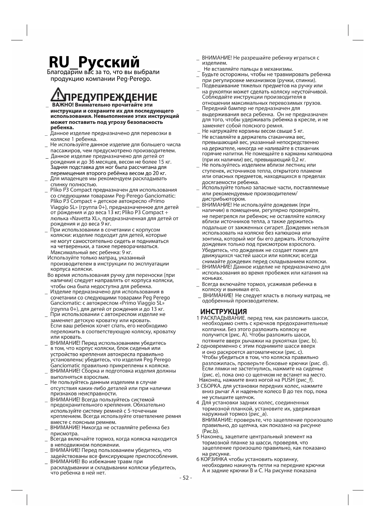 ПРЕДУПРЕЖДЕНИЕ _ ВАЖНО! Внимательно прочитайте эти инструкции и сохраните их для последующего использования. Невыполнение этих инструкций может поставить под угрозу безопасность ребенка. _ Данное изделие предназначено для перевозки в коляске 1 ребенка. _ Не используйте данное изделие для большего числа пассажиров, чем предусмотрено производителем. _ Данное изделие предназначено для детей от рождения и до 36 месяцев, весом не более 15 кг. Задняя подставка для ног была рассчитана для перемещения второго ребёнка весом до 20 кг. _ Для младенцев мы рекомендуем раскладывать спинку полностью. _ Pliko P3 Compact предназначен для использования со следующими товарами Peg-Perego Ganciomatic: Pliko P3 Compact + детское автокресло «Primo Viaggio SL» (группа 0+), предназначенное для детей от рождения и до веса 13 кг; Pliko P3 Compact + люлька «Navetta XL», предназначенная для детей от рождения и до веса 9 кг. _ При использовании в сочетании с корпусом коляски: изделие подходит для детей, которые не могут самостоятельно сидеть и подниматься на четвереньки, а также переворачиваться. Максимальный вес ребенка: 9 кг. Используйте только матрац, указанный производителем в инструкции по эксплуатации корпуса коляски. Во время использования ручку для переноски (при наличии) следует направлять от корпуса коляски, чтобы она была недоступна для ребенка. _ Изделие предназначено для использования в сочетании со следующими товарами Peg Perego Ganciomatic: с автокреслом «Primo Viaggio SL» (группа 0+), для детей от рождения и до 13 кг. _ При использовании с автокреслом изделие не заменяет детскую кроватку или кровать. Если ваш ребенок хочет спать, его необходимо переложить в соответствующую коляску, кроватку или кровать. _ ВНИМАНИЕ! Перед использованием убедитесь в том, что корпус коляски, блок сиденья или устройство крепления автокресла правильно установлены; убедитесь, что изделия Peg Perego Ganciomatic правильно прикреплены к коляске. _ ВНИМАНИЕ! Сборка и подготовка изделия должны выполняться взрослым. _ Не пользуйтесь данным изделием в случае отсутствия каких-либо деталей или при наличии признаков неисправности. _ ВНИМАНИЕ! Всегда пользуйтесь системой предохранительного крепления. Обязательно используйте систему ремней с 5-точечным креплением. Всегда используйте ответвление ремня вместе с поясным ремнем. _ ВНИМАНИЕ! Никогда не оставляйте ребенка без присмотра. _ Всегда включайте тормоз, когда коляска находится в неподвижном положении. _ ВНИМАНИЕ! Перед пользованием убедитесь, что задействованы все фиксирующие приспособления. _ ВНИМАНИЕ! Во избежание травм при раскладывании и складывании коляски убедитесь, что ребенка в ней нет. _ ВНИМАНИЕ! Не разрешайте ребенку играться с изделием. _ Не вставляйте пальцы в механизмы. _ Будьте осторожны, чтобы не травмировать ребенка при регулировке механизмов (ручки, спинки). _ Подвешивание тяжелых предметов на ручку или на рукоятки может сделать коляску неустойчивой. Соблюдайте инструкции производителя в отношении максимальных перевозимых грузов. _ Передний бампер не предназначен для выдерживания веса ребенка. Он не предназначен для того, чтобы удерживать ребенка в кресле, и не заменяет собой поясного ремня. _ Не нагружайте корзины весом свыше 5 кг. Не вставляйте в держатель стаканчика вес, превышающий вес, указанный непосредственно на держателе, никогда не наливайте в стаканчик горячие напитки. 