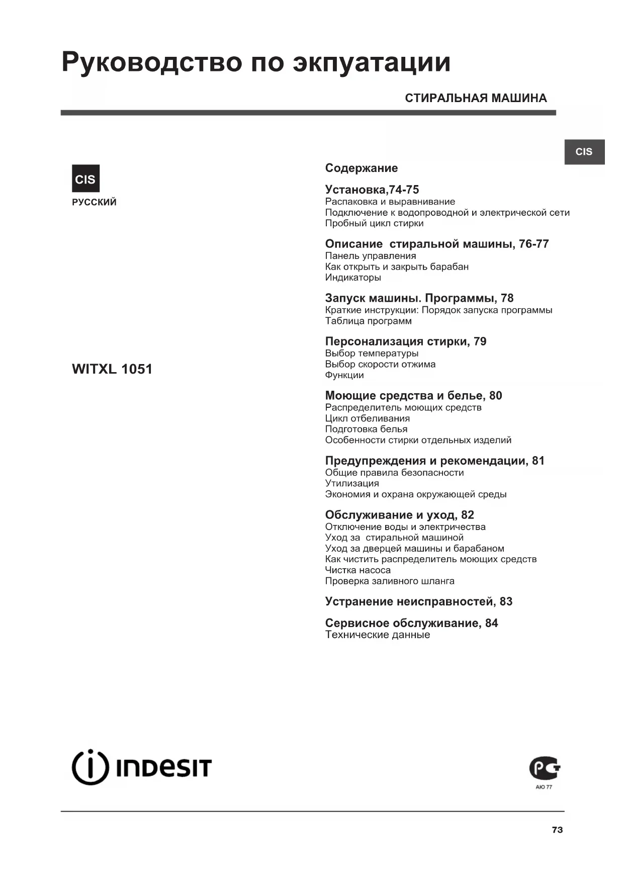 РУКОВОДСТВО ПОЛЬЗОВАТЕЛЯ WITXL 1051 INDESIT