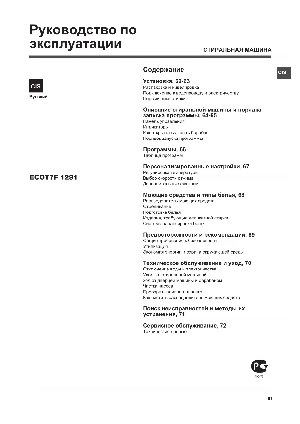 - Если белье должно сушиться в автоматической сушке, необходимо выбрать большую скорость отжима. Интенсивный отжим сэкономит время и электроэнергию при автоматической сушке.70 CIS Техническое обслуживание
