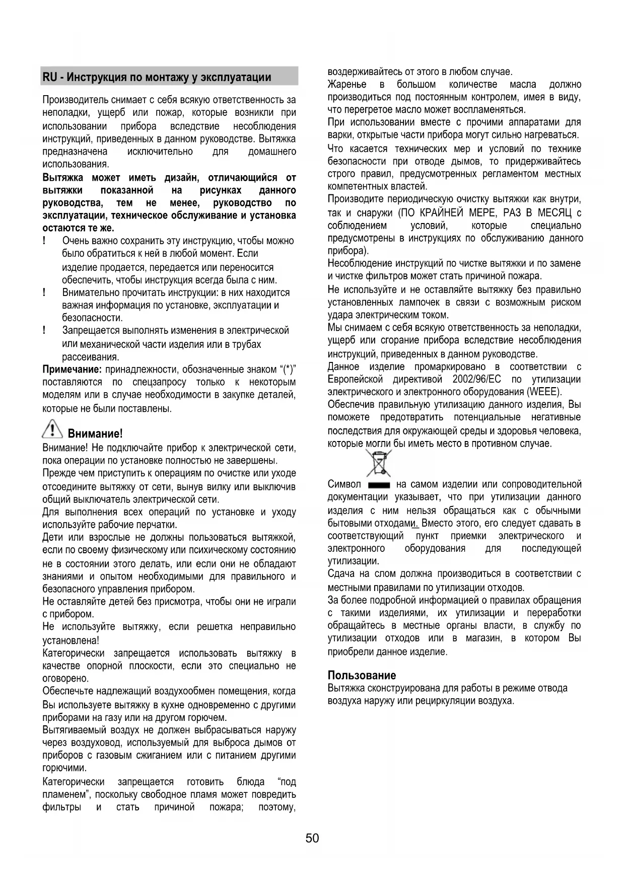 инструкций, приведенных в данном руководстве. Вытяжка