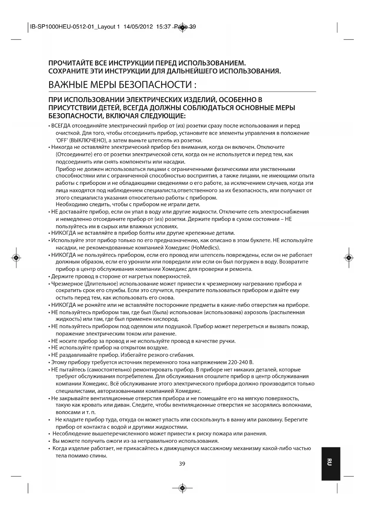 РУКОВОДСТВО ПОЛЬЗОВАТЕЛЯ SP1000HEU HOMEDICS