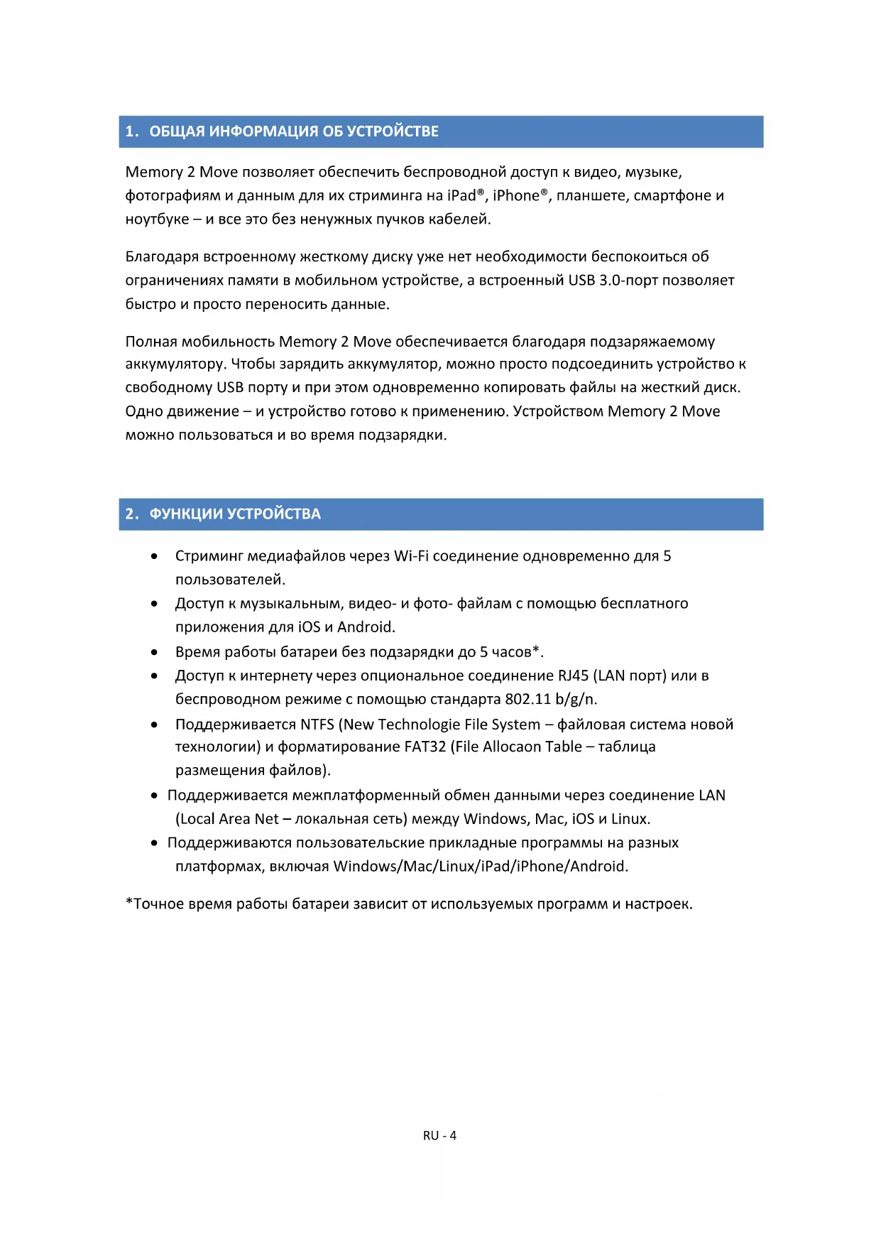 Стриминг медиафайлов через Wi-Fi соединение одновременно для 5 пользователей. Доступ к музыкальным, видео- и фото- файлам с помощью бесплатного приложения для iOS и Android. Время работы батареи без подзарядки до 5 часов*. Доступ к интернету через опциональное соединение RJ45 (LAN порт) или в беспроводном режиме с помощью стандарта 802.11 b/g/n. Поддерживается NTFS (New Technologie File System – файловая система новой технологии) и форматирование FAT32 (File Allocation Table – таблица размещения файлов). Поддерживается межплатформенный обмен данными через соединение LAN (Local Area Net – локальная сеть) между Windows, Mac, iOS и Linux. Поддерживаются пользовательские прикладные программы на разных платформах, включая Windows/Mac/Linux/iPad/iPhone/Android. *Точное время работы батареи зависит от используемых программ и настроек.RU - 5 Использование в качестве внешнего жесткого диска: Встроенный USB 3.0-порт позволяет осуществлять быструю передачу информации и заряжать батарею, когда Memory 2 Move соединен с компьютером или сетевым блоком питания. Он функционирует только тогда, когда устройство выключено. Использование в LAN соединении: Для этого соедините один конец кабеля RJ45 с Memory 2 Move, а другой конец – со свободным портом маршрутизатора. Теперь активируйте функцию DHCP (Dynamic Host Configuration Protocol – протокол динамического конфигурирования узла) на Memory 2 Move для автоматической настройки IP адреса.