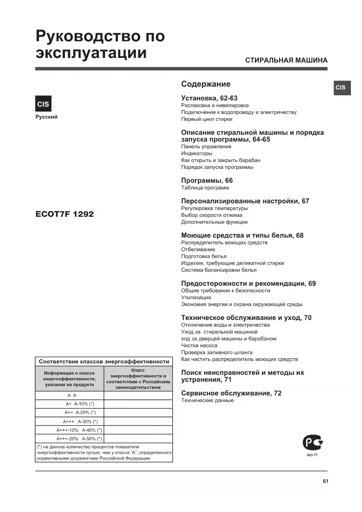 Экономия энергии и охрана окружающей среды Техническое обслуживание и уход, 70 Отключение воды и электричества Уход за стиральной машиной ход за дверцей машины и барабаном Чистка насоса Проверка заливного шланга Как чистить распределитель моющих средств Поиск неисправностей и методы их устранения, 71 Сервисное обслуживание, 72 Технические данные Руководство по эксплуатации СТИРАЛЬНАЯ МАШИНА Соответствие классов энергоэффективности Информация о классе энергоэффективности, указаная на продукте Класс энергоэффективности в соответствии с Российским законодательством A A A+ A10% (*) A++ A20% (*) A+++ A30% (*) A+++10% A40% (*) A+++20% A50% (*)(*) на данное количество процентов показатели энергоэффективности лучше, чем у класса “А”, определенного нормативными документами Российской Федерации.62 CIS Правильное выравнивание оборудования поможет избежать шума, вибраций и смещений во время работы
