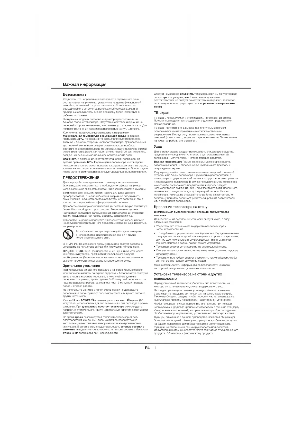Для обеспечения безопасной установки следует иметь в виду следующие замечания: šȯȽɁɀɄɎɁɍɘɓɎɊɍɎɁɉȼɈɊɂɁɎȾɗɀɁɌɂȼɎɘȾɁɍɎɁɇɁȾɄɃɊɌȼɄ настенного крепления. š ȭɇɁɀɏɅɎɁɄɉɍɎɌɏɆɒɄɛɈɋɊɉȼɍɎɁɉɉɊɅɏɍɎȼɉɊȾɆɁȫɁɌɁɀɈɊɉɎȼɂɊɈɉȼ стену для некоторых моделей удостоверьтесь в прочности крепления, ввинтив шестиугольные винты VESA в дюбеля (и винты), в гайки стенного монтажа с задней панели вашего устройства. šȮɁɇɁȾɄɃɊɌɍɇɁɀɏɁɎɏɍɎȼɉȼȾɇɄȾȼɎɘɉȼȾɁɌɎɄɆȼɇɘɉɊɅɍɎɁɉɁ šȭɇɁɀɏɁɎɄɍɋɊɇɘɃɊȾȼɎɘɎɊɇɘɆɊɈɊɉɎȼɂɉɗɁȾɄɉɎɗɍɊɊɎȾɁɎɍɎȾɏɚɕɄɁ материалу стены. šȮɁɇɁȾɄɃɄɊɉɉɗɁɆȼȽɁɇɄɍɇɁɀɏɁɎɌȼɃɈɁɍɎɄɎɘɎȼɆɄɈɊȽɌȼɃɊɈɓɎɊȽɗ они не препятствовали движению людей. Можно использовать информацию по безопасности из любых инструкций, выпускаемых для наших телевизоров. Установка телевизора на столе и других поверхностях Перед установкой телевизора убедитесь, что поверхность, на которую он устанавливается, может выдержать его вес. Не следует размещать телевизор на неустойчивом основании (например, на передвижных полках или на самом краю секции), Также необходимо следить, чтобы передняя часть телевизора не выступала за пределы поверхности, на которой он установлен. Чтобы телевизор не упал, прикрепите его на стене при помощи необходимых шурупов (в крепежных отверстиях в стене по стандарту Vesa), зажимов и креплений, которые можно приобрести отдельно. Чтобы телевизор не упал назад, установите его вплотную к стене. Функции, описанные в данном руководстве, являются общими для большинства моделей. Некоторые функции могут быть не доступны на Вашем телевизоре, и/или Ваш телевизор может содержать функции, не описанные в данном руководстве пользователя. Иллюстрации в этом руководстве могут отличаться от фактического продукта. Обратитесь к фактическому продукту.RU