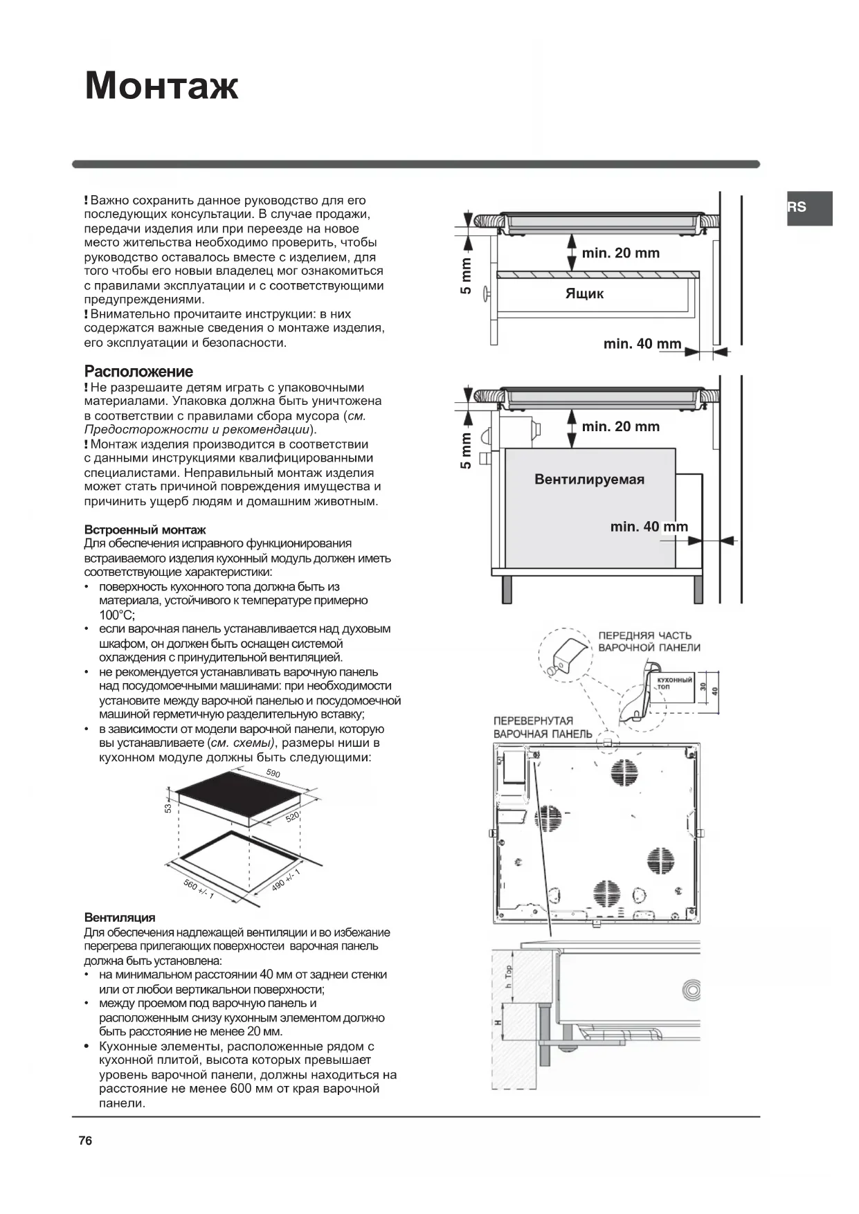 Монтаж изделия производится в соответствии с данными инструкциями квалифицированными специалистами. Неправильный монтаж изделия может стать причиной повреждения имущества и причинить ущерб людям и домашним животным. Встроенный монтаж Для обеспечения исправного функционирования встраиваемого изделия кухонный модуль должен иметь соответствующие характеристики: