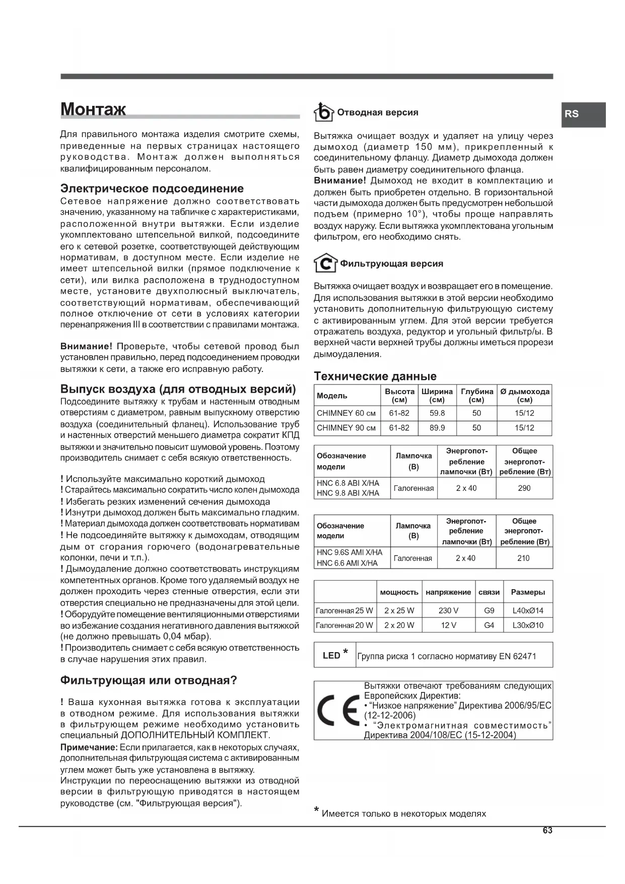 наружу. Если вытяжка укомплектована угольным фильтром, его необходимо снять. Фильтрующая версия Вытяжка очищает воздух и возвращает его в помещение. Для использования вытяжки в этой версии необходимо установить дополнительную фильтрующую систему с активированным углем. Для этой версии требуется отражатель воздуха, редуктор и угольный фильтр/ы. В верхней части верхней трубы должны иметься прорези дымоудаления. Технические данные МодельВысота (см)Ширина (см)Глубина (см)Ø дымохода (см) CHIMNEY 60 см 61-82 59.8 50 15/12 CHIMNEY 90 см 61-82 89.9 50 15/12 Обозначение моделиЛампочка (В)Энергопот-ребление лампочки (Вт)Общее энергопот-ребление (Вт)HNC 6.8 ABI X/HAHNC 9.8 ABI X/HAГалогенная 2 x 40 290Обозначение моделиЛампочка (В)Энергопот-ребление лампочки (Вт)Общее энергопот-ребление (Вт)HNC 9.6S AMI X/HAHNC 6.6 AMI X/HAГалогенная 2 x 40 210 мощность напряжение связи Размеры 25 W 2 x 25 W 230 V G9 L40xØ14 20 W 2 x 20 W 12 V G4 L30xØ10 LED * Группа риска 1 согласно нормативу EN 62471 Вытяжки отвечают требованиям следующих Европейских Директив: