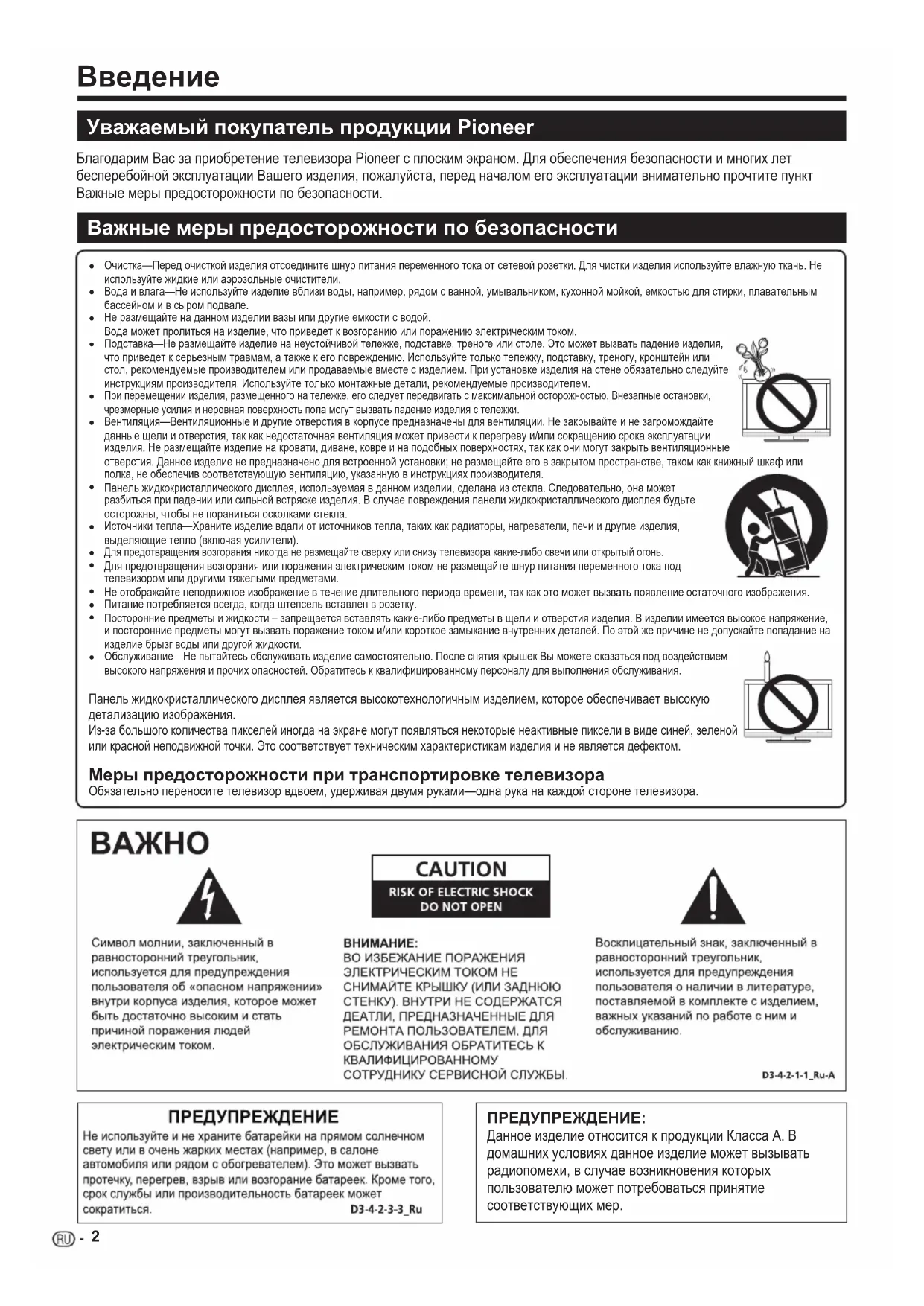 Благодарим Вас за приобретение телевизора Pioneer с плоским экраном. Для обеспечения безопасности и многих лет