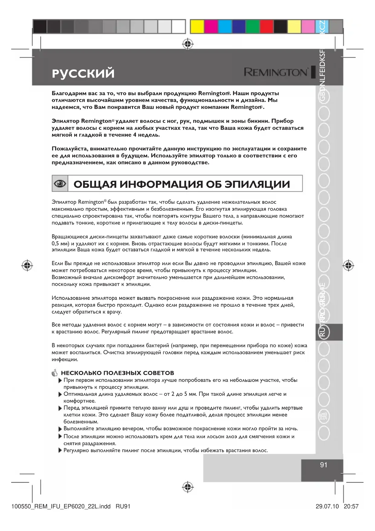 Эпилятор Remington удаляет волосы с ног, рук, подмышек и зоны бикини. Прибор удаляет волосы с корнем на любых участках тела, так что Ваша кожа будет оставаться мягкой и гладкой в течение 4 недель.Пожалуйста, внимательно прочитайте данную инструкцию по эксплуатации и сохраните ее для использования в будущем. Используйте эпилятор только в соответствии с его предназначением, как описано в данном руководстве. ОБЩАЯ ИНФОРМАЦИЯ ОБ ЭПИЛЯЦИИ Эпилятор Remington был разработан так, чтобы сделать удаление нежелательных волос максимально простым, эффективным и безболезненным. Его изогнутая эпилирующая головка специально спроектирована так, чтобы повторять контуры Вашего тела, а направляющие помогают подавать тонкие, короткие и прилегающие к телу волосы в диски-пинцеты.Вращающиеся диски-пинцеты захватывают даже самые короткие волоски (минимальная длина 0,5 мм) и удаляют их с корнем. Вновь отрастающие волосы будут мягкими и тонкими. После эпиляции Ваша кожа будет оставаться гладкой и мягкой в течение нескольких недель.Если Вы прежде не использовали эпилятор или если Вы давно не проводили эпиляцию, Вашей коже может потребоваться некоторое время, чтобы привыкнуть к процессу эпиляции. Возможный вначале дискомфорт значительно уменьшается при дальнейшем использовании, поскольку кожа привыкает к эпиляции.Использование эпилятора может вызвать покраснение или раздражение кожи. Это нормальная реакция, которая быстро проходит. Однако если раздражение не прошло в течение трех дней, следует обратиться к врачу.Все методы удаления волос с корнем могут – в зависимости от состояния кожи и волос – привести к врастанию волос. Регулярный пилинг предотвращает врастание волос.В некоторых случаях при попадании бактерий (например, при перемещении прибора по коже) кожа может воспалиться. Очистка эпилирующей головки перед каждым использованием уменьшает риск инфекции. НЕСКОЛЬКО ПОЛЕЗНЫХ СОВЕТОВ