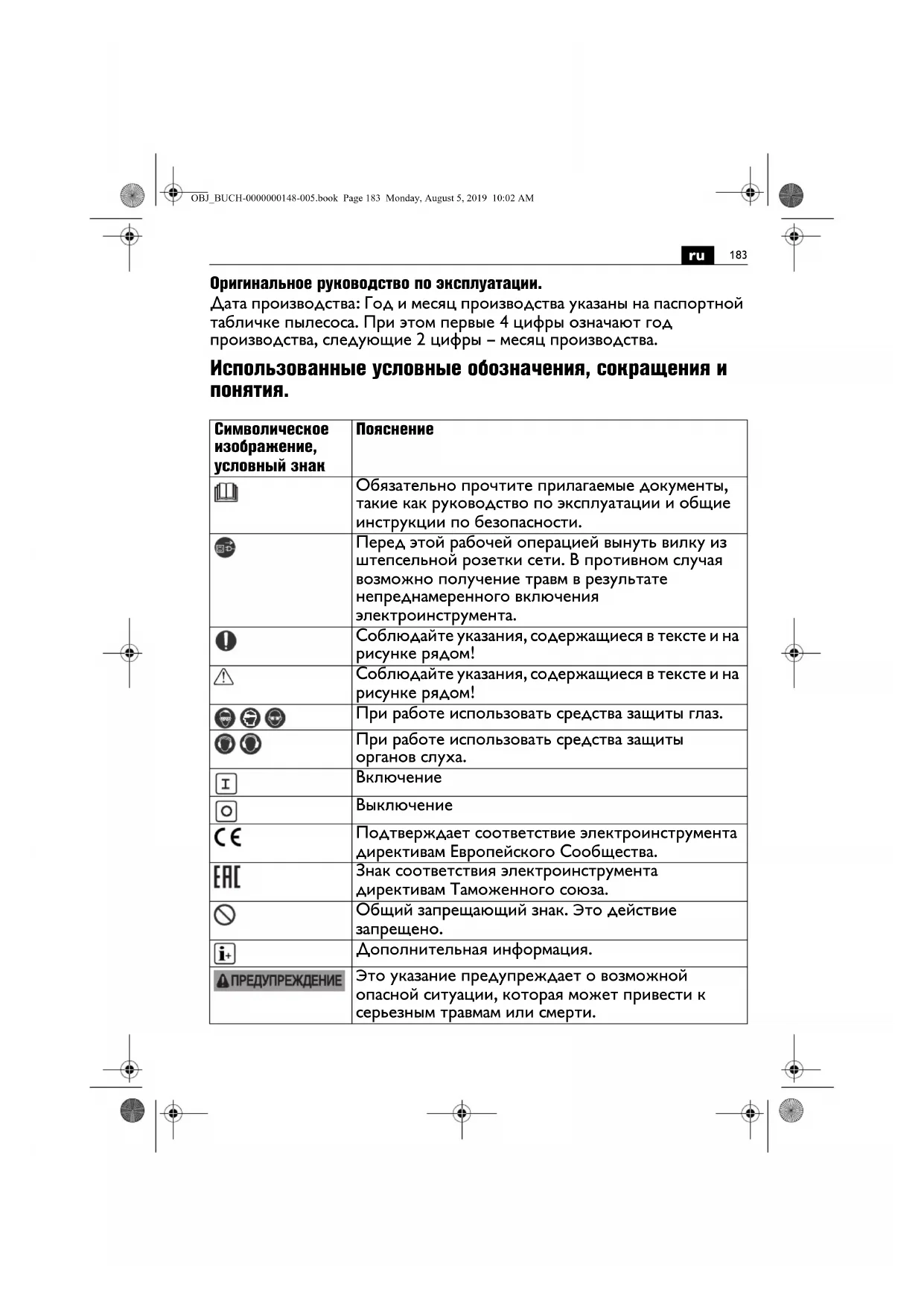 Оригинальное руководство по эксплуатации. Дата производства: Год и месяц производства указаны на паспортной табличке пылесоса. При этом первые 4 цифры означают год производства, следующие 2 цифры – месяц производства. Использованные условные обозначения, сокращения и
