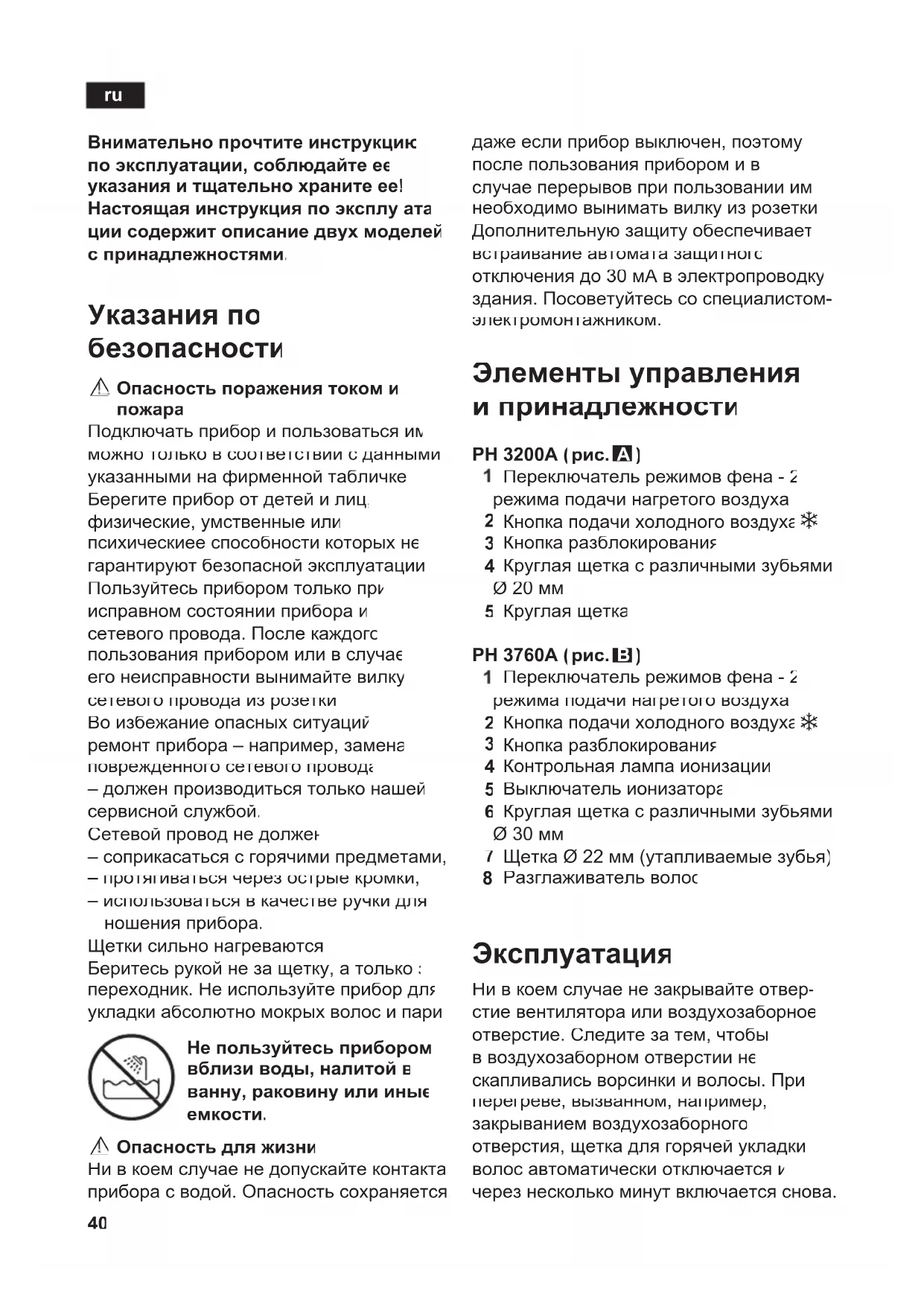даже если прибор выключен, поэтому после пользования прибором и в случае перерывов при пользовании им необходимо вынимать вилку из розетки. Дополнительную защиту обеспечивает встраивание автомата защитного отключения до 30 мA в электропроводку здания. Посоветуйтесь со специалистом- электромонтажником. Элементы управления и принадлежности PH 3200A (
