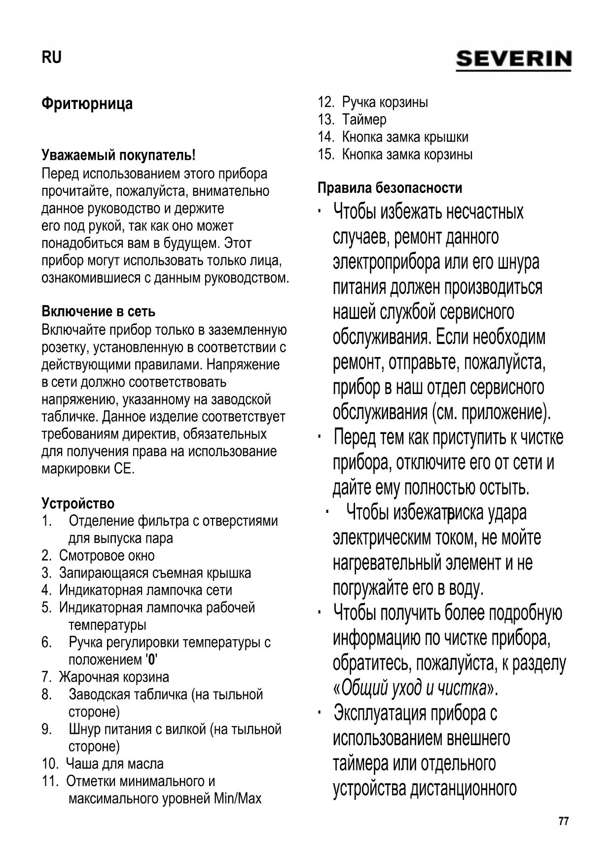 Правила безопасности ∙ Чтобы избежать несчастных случаев, ремонт данного электроприбора или его шнура питания должен производиться нашей службой сервисного обслуживания. Если необходим ремонт, отправьте, пожалуйста, прибор в наш отдел сервисного обслуживания (см. приложение). ∙ Перед тем как приступить к чистке прибора, отключите его от сети и дайте ему полностью остыть. ∙ Чтобы избежать риска удара электрическим током, не мойте нагревательный элемент и не погружайте его в воду. ∙ Чтобы получить более подробную информацию по чистке прибора, обратитесь, пожалуйста, к разделу «Общий уход и чистка». ∙ Эксплуатация прибора с использованием внешнего таймера или отдельного устройства дистанционного RU78 управления не допускается. ∙ Возьмите прибор за ручки и поставьте его на устойчивую теплостойкую рабочую поверхность (которая не боится ни брызг ни пятен и вокруг которой имеется достаточно свободного пространства), чтобы не допустить разбрызгивания горячего масла.