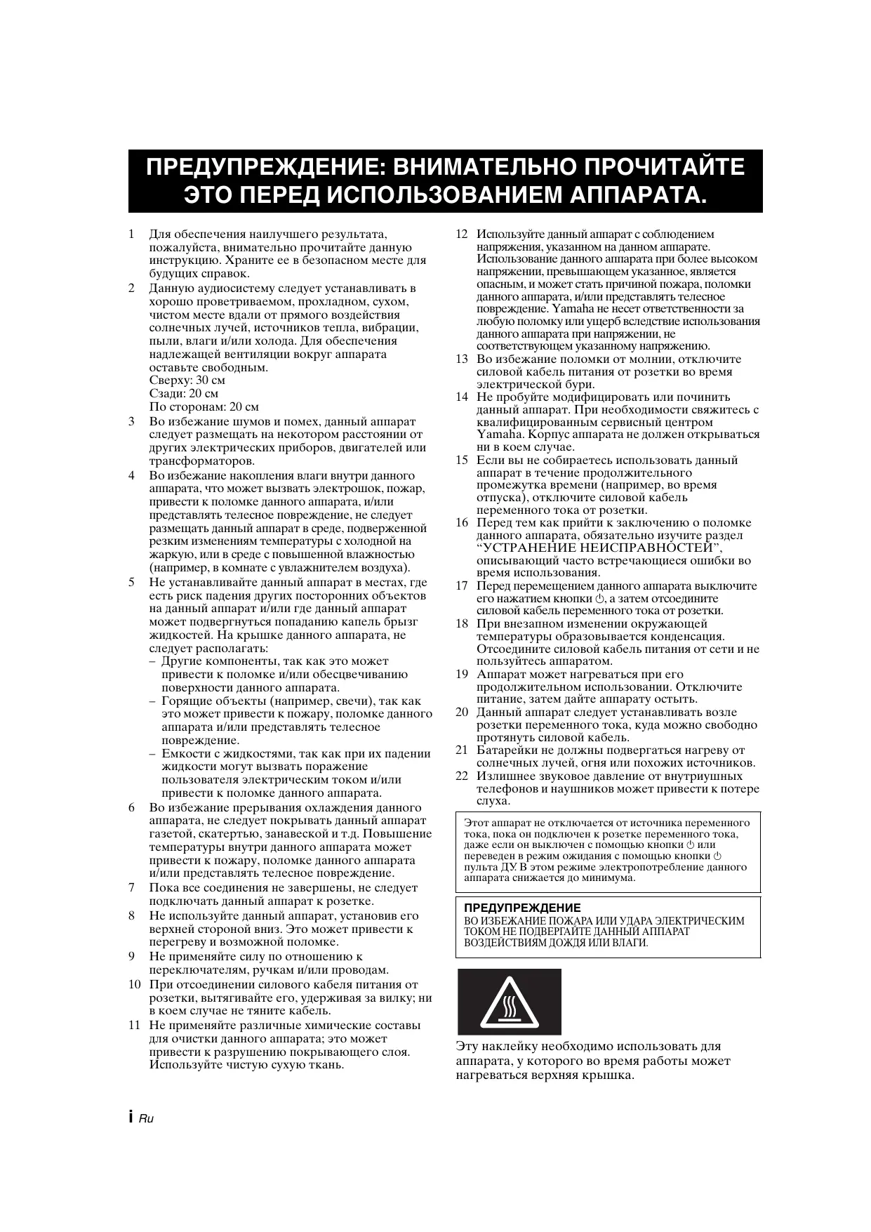 14 Ne tentez pas de modifier ni de réparer l’appareil. Consultez le service Yamaha compétent pour toute réparation qui serait requise. Le coffret de l’appareil ne doit jamais être ouvert, quelle que soit la raison. 15 Si vous envisagez de ne pas vous servir de l’appareil pendant une longue période (par exemple, pendant les vacances), débranchez la fiche du câble d’alimentation au niveau de la prise secteur. 16 Lisez la section intitulée « GUIDE DE DÉPANNAGE » où figurent une liste d’erreurs de manipulation communes avant de conclure que l’appareil présente une anomalie de fonctionnement. 17 Avant de déplacer l’appareil, appuyez sur A pour mettre l’appareil hors tension, puis débranchez la fiche du cordon d’alimentation au niveau de la prise secteur. 18 La condensation se forme lorsque la température ambiante change brusquement. En ce cas, débranchez la fiche du câble d’alimentation et laissez l’appareil reposer. 19 La température de l’appareil peut augmenter en raison d’une utilisation prolongée. En ce cas, coupez l’alimentation de l’appareil et laissez-le au repos pour qu’il refroidisse. 20 Installez cet appareil à proximité de la prise secteur et à un emplacement où la fiche du câble d’alimentation est facilement accessible. 21 Les piles ne doivent pas être exposées à une chaleur extrême, par exemple au soleil, à une flamme, etc. 22 Une pression excessive du son par les écouteurs et le casque d’écoute peut entraîner la perte de l’ouïe. Aussi longtemps que cet appareil est raccordé à la prise secteur murale, il n’est pas débranché de la source d’alimentation secteur même si vous le mettez hors tension à l’aide de la touche A ou le mettez en mode veille à l’aide de la touche A de la télécommande. En mode veille, l’appareil consomme une très faible quantité de courant.