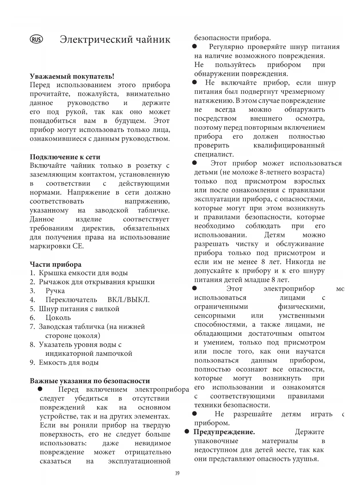 38Электрический чайник Уважаемый покупатель! Перед использованием этого прибора прочитайте, пожалуйста, внимательно данное руководство и держите его под рукой, так как оно может понадобиться вам в будущем. Этот прибор могут использовать только лица, ознакомившиеся с данным руководством. Подключение к сети Включайте чайник только в розетку с зазeмляющим контактом, установленную в соотвeтствии с действующими нормами. Напряжениe в сeти должно соотвeтствовать напряжeнию, указанному на заводской табличкe. Данное изделие соответствует требованиям директив, обязательных для получения права на использование маркировки СЕ. Части прибора