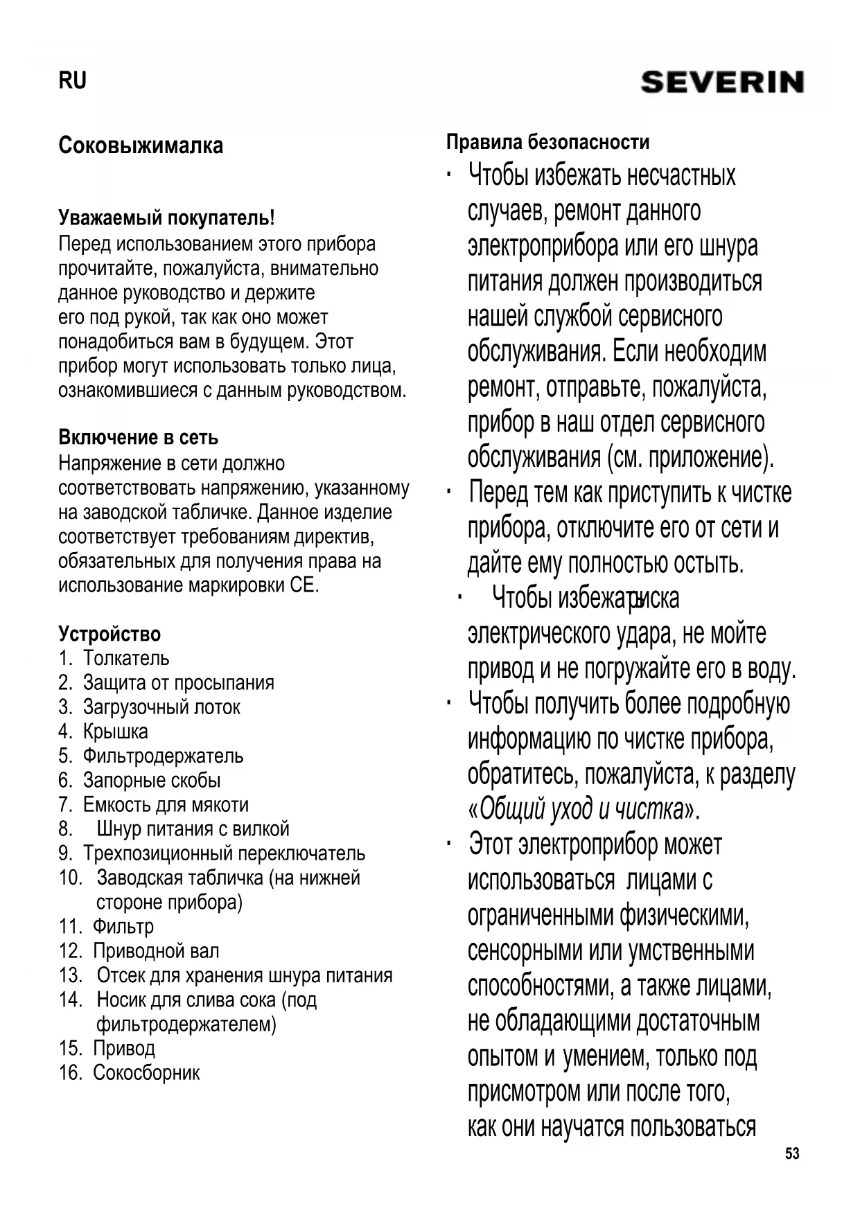 Η εγγύηση αυτή δεν καλύπτει φυσικές φθορές ούτε τα εύθραυστα μέρη της συσκευής.53 Соковыжималка Уважаемый покупатель! Перед использованием этого прибора прочитайте, пожалуйста, внимательно данное руководство и держите его под рукой, так как оно может понадобиться вам в будущем. Этот прибор могут использовать только лица, ознакомившиеся с данным руководством. Включение в сеть Напряжение в сети должно соответствовать напряжению, указанному на заводской табличке. Данное изделие соответствует требованиям