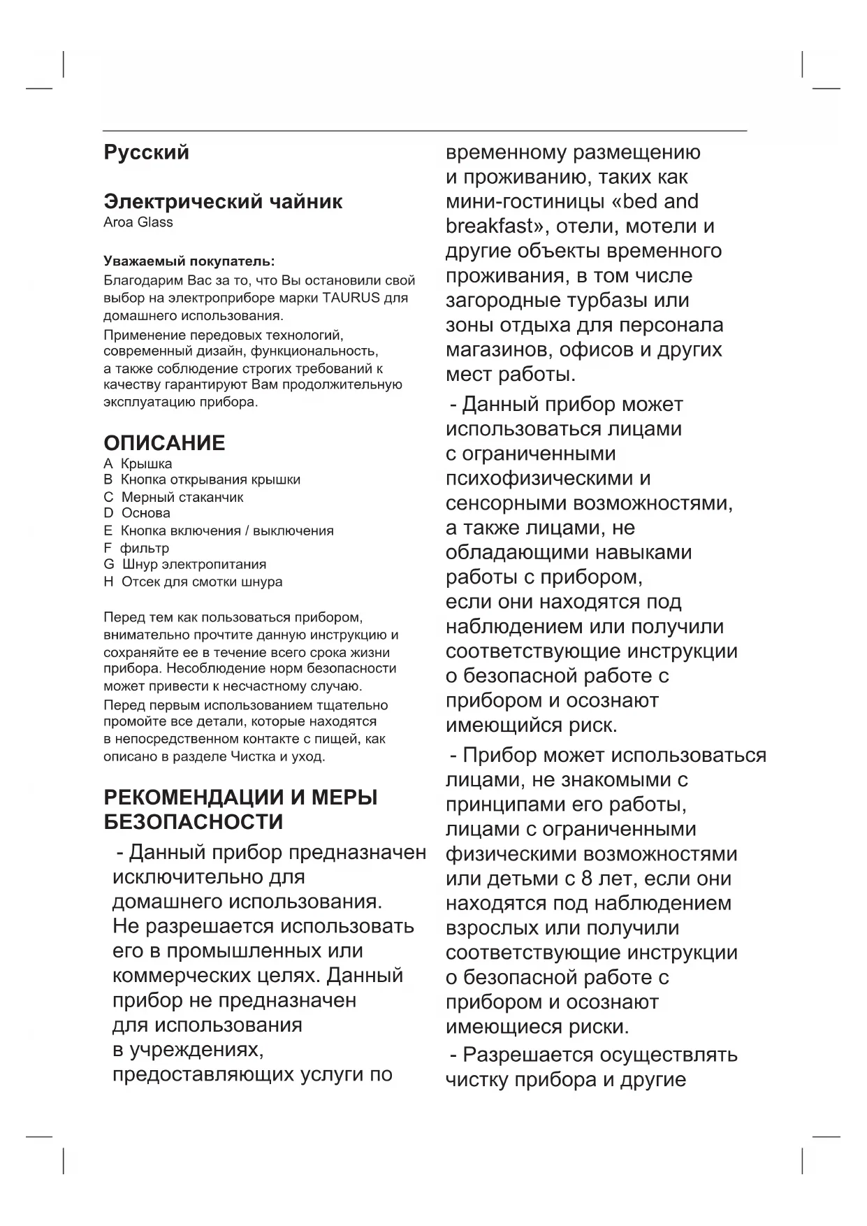 - Ни сам прибор, ни его упаковка не содержат веществ, представляющих опасность для окружающей среды. Данный символ означает, что по окончании полезной жизни прибора следует передать его в пункт приема отслуживших электрических и электронных приборов (RAEE) или в руки представителя соответствующей организации. Прибор изготовлен в соответствии с Директивой 2006/95/EC по низковольтному оборудованию, Директивой 2004/108/ EC по электромагнитной совместимости, Директивой 2011/65/EC по ограничению использования определенных опасных материалов для производства электрического и электронного оборудования и Директивой 2009/125/ EC, учреждающей систему требований к экологическому проектированию продукции, связанной с энергопотреблением.Română Fierbător de apă Aroa Glass Stimate client, Va multumim ca ati ales un produs electrocasnic marca TAURUS. Designul, performantele si tehnologia acestui aparat, cat si controalele stricte in ceea ce prives- te calitatea in timpul procesului de fabricatie, va vor furniza satisfactii depline pentru multi ani. DESCRIEREA A Capac B Buton deschidere capac C Cană D Bază E Buton de pornire / oprire F Filtru G Cablu de alimentare H Compartiment cablu Cititi cu atentie acest manual de instructiuni înain- te de a pune aparatul în functiune si pãstrati-l pentruconsulteulterioare.Necitireaşinerespec- tareaacestorinstrucţiunipotaveacarezultatun accident. Înainte de prima utilizare a produsului, se vor curăţapărţilecareintrăîncontactcualimente- leconforminstrucţiunilordinsecţiuneaprivind curăţarea.