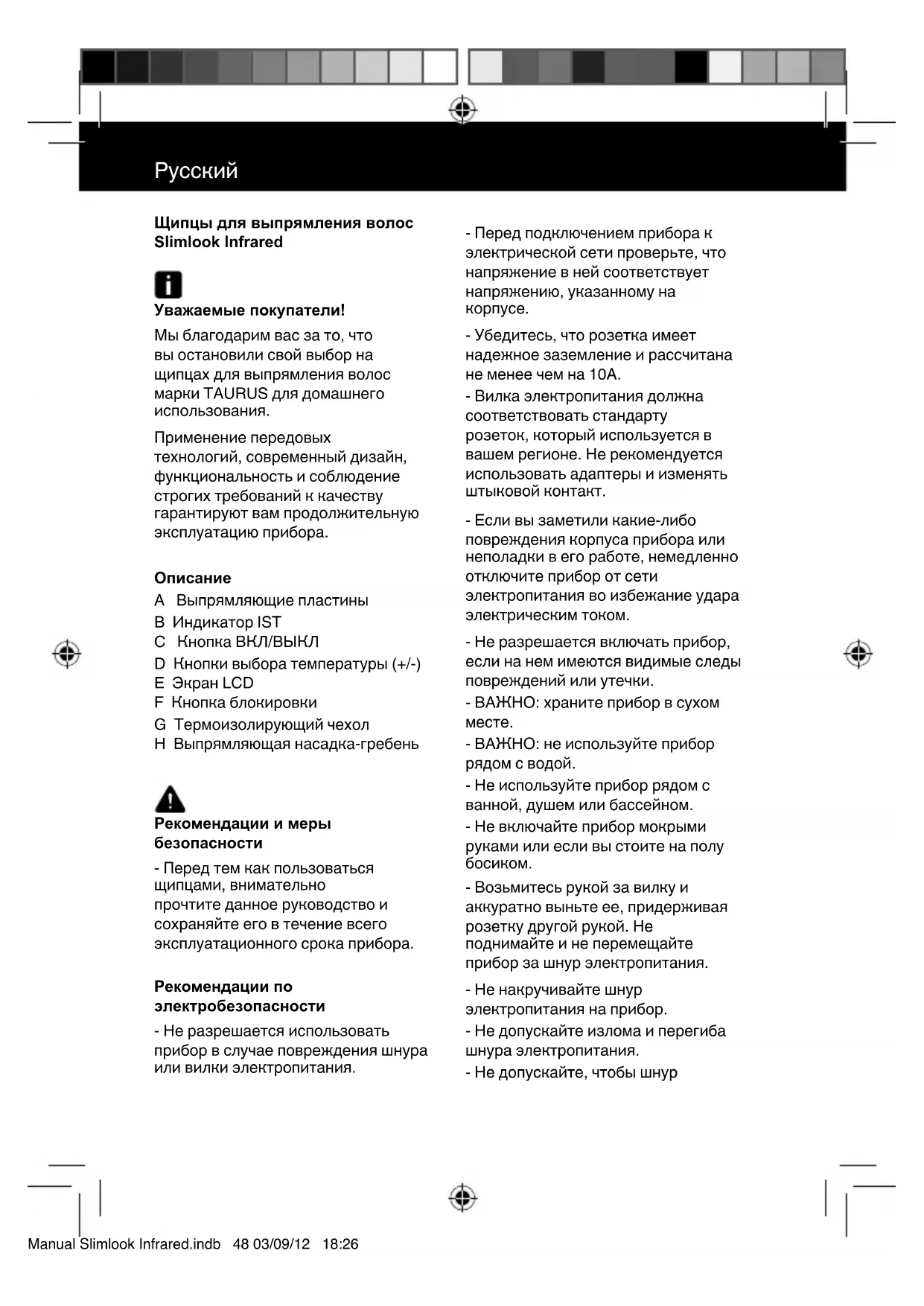 Η παρούσα συσκευή πληροί την Οδηγία 2006/95/ΕΟΚ Χαμηλής Τσης και την Οδηγία 2004/108/ΕΟΚ Ηλεκτρομαγνητικής Συμβατότητας. Manual Slimlook Infrared.indb 47 03/09/12 18:26Русски Щипцы для выпрямления волос Slimlook Infrared Уважаемые покупатели! Мы благодарим вас за то, что вы остановили сво выбор на щипцах для выпрямления волос марки TAURUS для домашнего использования. Применение передовых технологи, современны дизан, функциональность и соблюдение строгих требовани к качеству гарантируют вам продолжительную эксплуатацию прибора.