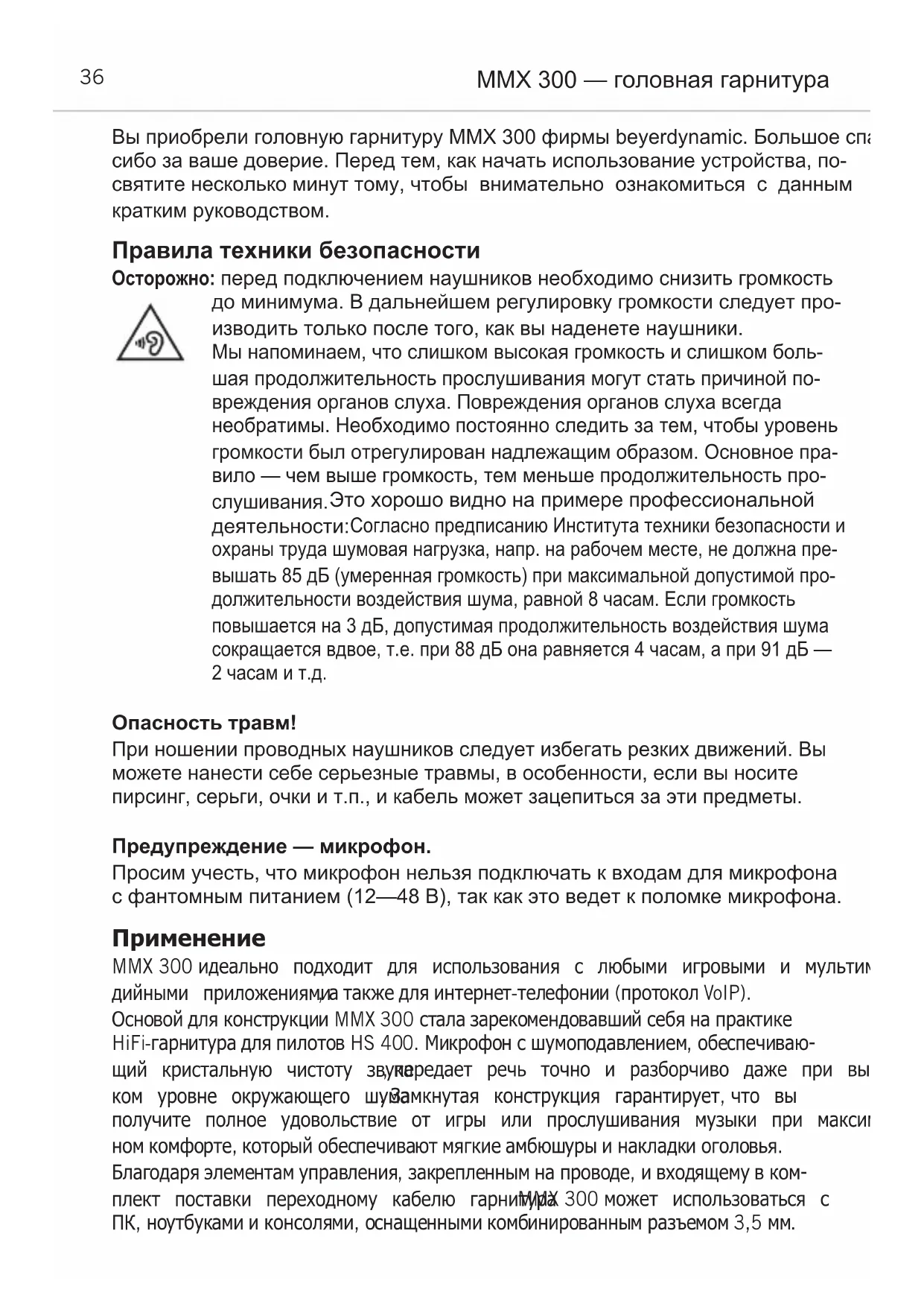 Вы приобрели головную гарнитуру MMX 300 фирмы beyerdynamic. Большое спа- сибо за ваше доверие. Перед тем, как начать использование устройства, по- святите несколько минут тому, чтобы внимательно ознакомиться с данным кратким руководством. Правила техники безопасности