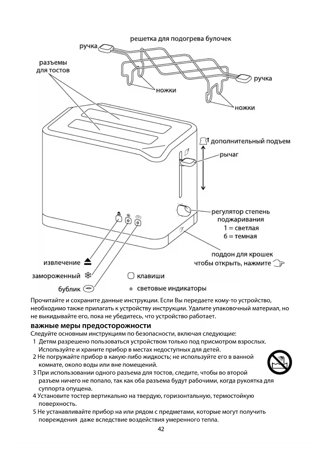 решетка для подогрева булочек 22 Решетку для подогрева булочек следует использовать только при уровне поджарки 1. 23 Не используйте решетку для подогрева замороженных булочек, а также намазанных маслом, глазурованных или содержащих начинку. 24 Установите решетку для подогрева булочек сверху на тостер, вставив ее ножки в пазы. 25 Разложите булочки на решетке. 26 Установите уровень поджарки 1 и опустите рычаг. 27 Когда рычаг поднимется, снимите подогретые булочки. 28 Чтобы не обжечься, не прикасайтесь к прутьям решетки. 29 Снимите решетку для использования тостера обычным образом. полезные советы 30 При поджаривании более одного кусочка хлеба, используйте кусочки одинакового размера, толщины и свежести. 31 Старый (вчерашний) хлеб содержит меньше влаги, тост будет более хрустящим. 32 Старый или тонкий кусок хлеба готовится быстрее, чем свежий или толстый кусок. Используйте низкую настройку. 33 Сладкие хлебобулочные изделия (кексы к чаю, пироги и т.д.) зажариваются гораздо быстрее, чем обычный хлеб, и должны поджариваться на установке «светлее».