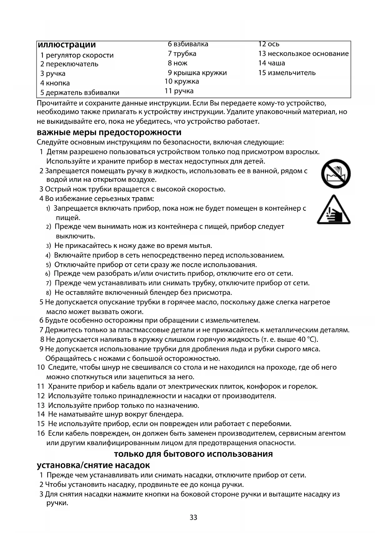 10 Не используйте трубку более 2 минут, взбивалку более 5 минут, измельчитель более 30