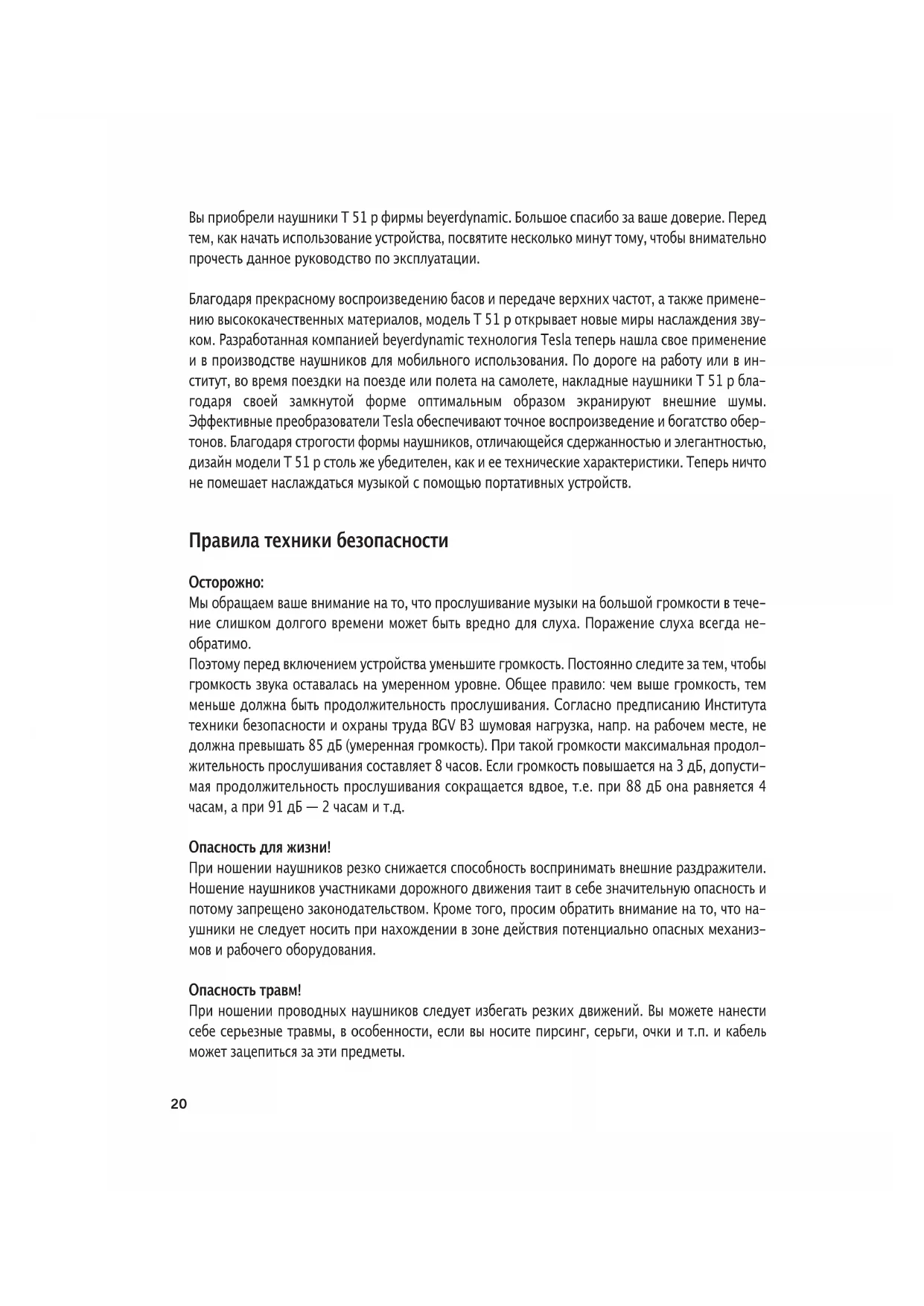 - Retirez le film de protection du coussinet des oreillettes neuf et collez-le.20 Вы приобрели наушники T 51 p фирмы beyerdynamic. Большое спасибо за ваше доверие. Перед тем, как начать использование устройства, посвятите несколько минут тому, чтобы внимательно прочесть данное руководство по эксплуатации. Благодаря прекрасному воспроизведению басов и передаче верхних частот, а также примене- нию высококачественных материалов, модель T 51 p открывает новые миры наслаждения зву- ком. Разработанная компанией beyerdynamic технология Tesla теперь нашла свое применение и в производстве наушников для мобильного использования. По дороге на работу или в ин- ститут, во время поездки на поезде или полета на самолете, накладные наушники T 51 p бла- годаря своей замкнутой форме оптимальным образом экранируют внешние шумы. Эффективные преобразователи Tesla обеспечивают точное воспроизведение и богатство обер- тонов. Благодаря строгости формы наушников, отличающейся сдержанностью и элегантностью, дизайн модели T 51 p столь же убедителен, как и ее технические характеристики. Теперь ничто не помешает наслаждаться музыкой с помощью портативных устройств. Правила техники безопасности