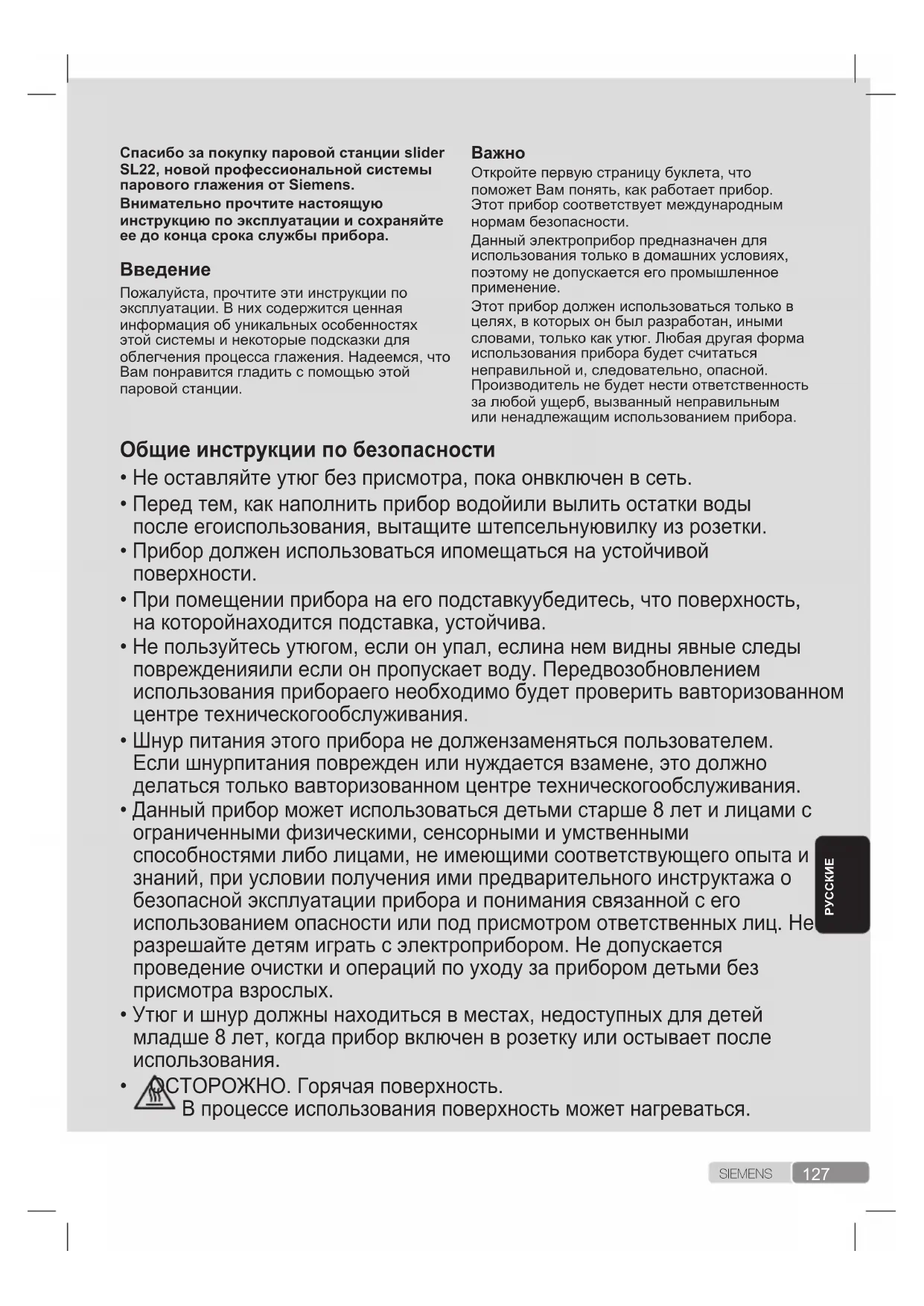 В процессе использования поверхность может нагреваться.128 S I E M E N SРУССКИЕ Описание