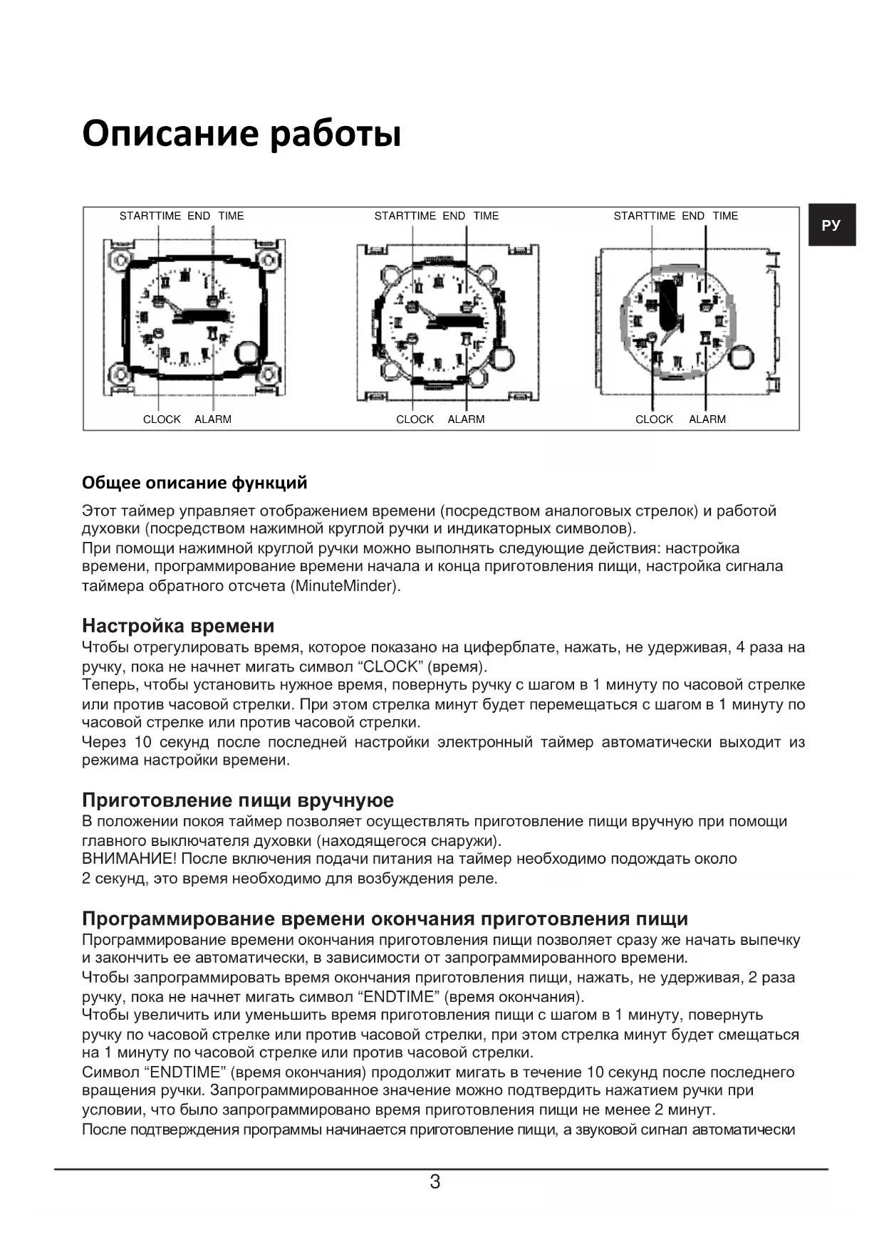 Общее описание функций Этот таймер управляет отображением времени (посредством аналоговых стрелок) и работой духовки (посредством нажимной круглой ручки и индикаторных символов). При помощи нажимной круглой ручки можно выполнять следующие действия: настройка времени, программирование времени начала и конца приготовления пищи, настройка сигнала таймера обратного отсчета (MinuteMinder). Настройка времени Чтобы отрегулировать время, которое показано на циферблате, нажать, не удерживая, 4 раза на ручку, пока не начнет мигать символ “CLOCK” (время). Теперь, чтобы установить нужное время, повернуть ручку с шагом в 1 минуту по часовой стрелке или против часовой стрелки. При этом стрелка минут будет перемещаться с шагом в 1 минуту по часовой стрелке или против часовой стрелки. Через 10 секунд после последней настройки электронный таймер автоматически выходит из режима настройки времени. Приготовление пищи вручнуюe В положении покоя таймер позволяет осуществлять приготовление пищи вручную при помощи главного выключателя духовки (находящегося снаружи). ВНИМАНИЕ! После включения подачи питания на таймер необходимо подождать около 2 секунд, это время необходимо для возбуждения реле. Программирование времени окончания приготовления пищи Программирование времени окончания приготовления пищи позволяет сразу же начать выпечку и закончить ее автоматически, в зависимости от запрограммированного времени. Чтобы запрограммировать время окончания приготовления пищи, нажать, не удерживая, 2 раза ручку, пока не начнет мигать символ “ENDTIME” (время окончания). Чтобы увеличить или уменьшить время приготовления пищи с шагом в 1 минуту, повернуть ручку по часовой стрелке или против часовой стрелки, при этом стрелка минут будет смещаться на 1 минуту по часовой стрелке или против часовой стрелки. Символ “ENDTIME” (время окончания) продолжит мигать в течение 10 секунд после последнего вращения ручки. Запрограммированное значение можно подтвердить нажатием ручки при условии, что было запрограммировано время приготовления пищи не менее 2 минут. После подтверждения программы начинается приготовление пищи, а звуковой сигнал автоматически4