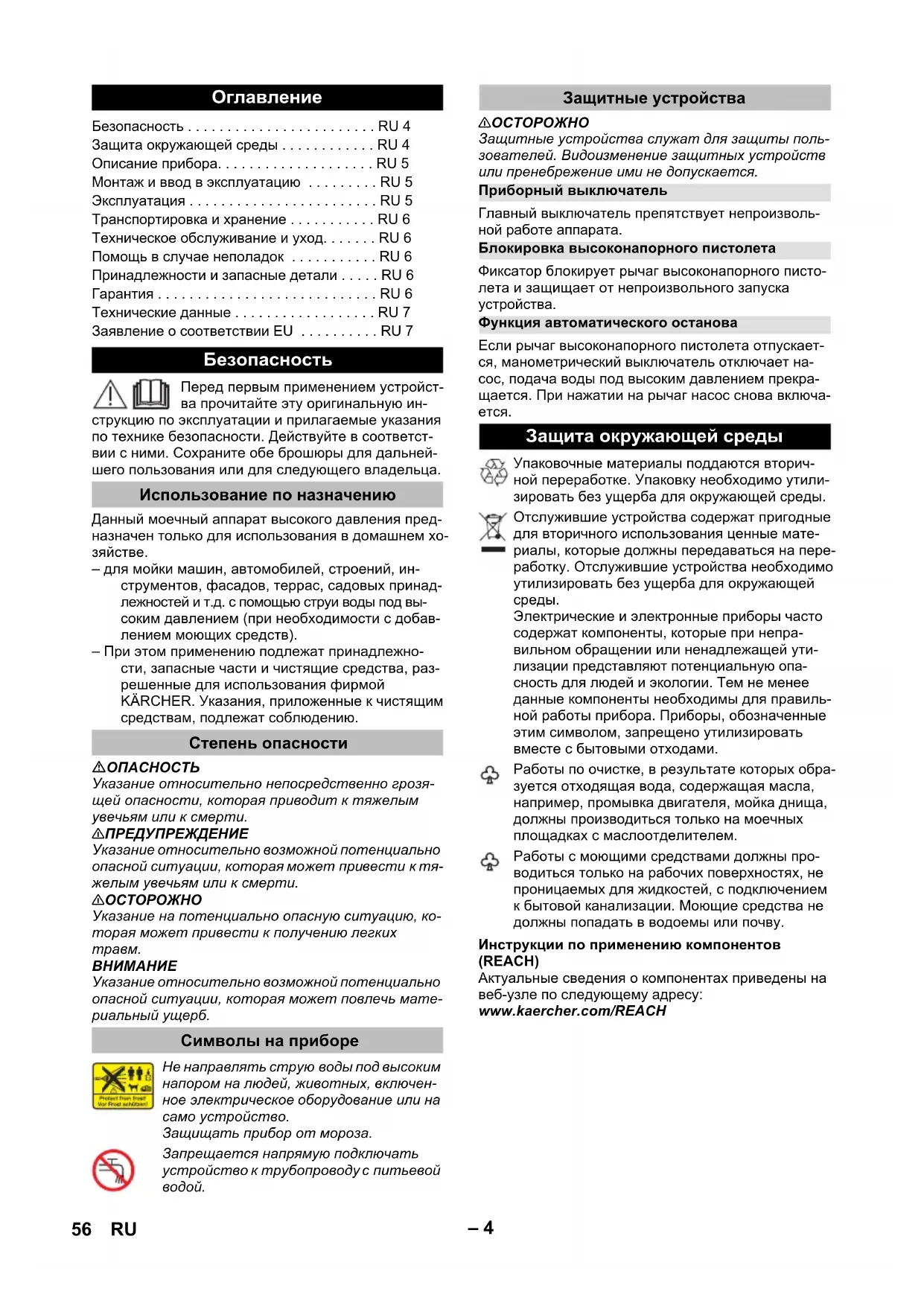 Безопасность . . . . . . . . . . . . . . . . . . . . . . . . RU 4 Защита окружающей среды . . . . . . . . . . . . RU 4 Описание прибора. . . . . . . . . . . . . . . . . . . . RU 5 Монтаж и ввод в эксплуатацию . . . . . . . . . RU 5 Эксплуатация . . . . . . . . . . . . . . . . . . . . . . . . RU 5 Транспортировка и хранение . . . . . . . . . . . RU 6 Техническое обслуживание и уход. . . . . . . RU 6 Помощь в случае неполадок . . . . . . . . . . . RU 6 Принадлежности и запасные детали . . . . . RU 6 Гарантия . . . . . . . . . . . . . . . . . . . . . . . . . . . . RU 6 Технические данные . . . . . . . . . . . . . . . . . . RU 7 Заявление о соответствии ЕU . . . . . . . . . . RU 7 Безопасность Использование по назначению Степень опасности Символы на приборе Не направлять струю воды под высоким напором на людей, животных, включен- ное электрическое оборудование или на само устройство. Защищать прибор от мороза. Запрещается напрямую подключать устройство к трубопроводу с питьевой