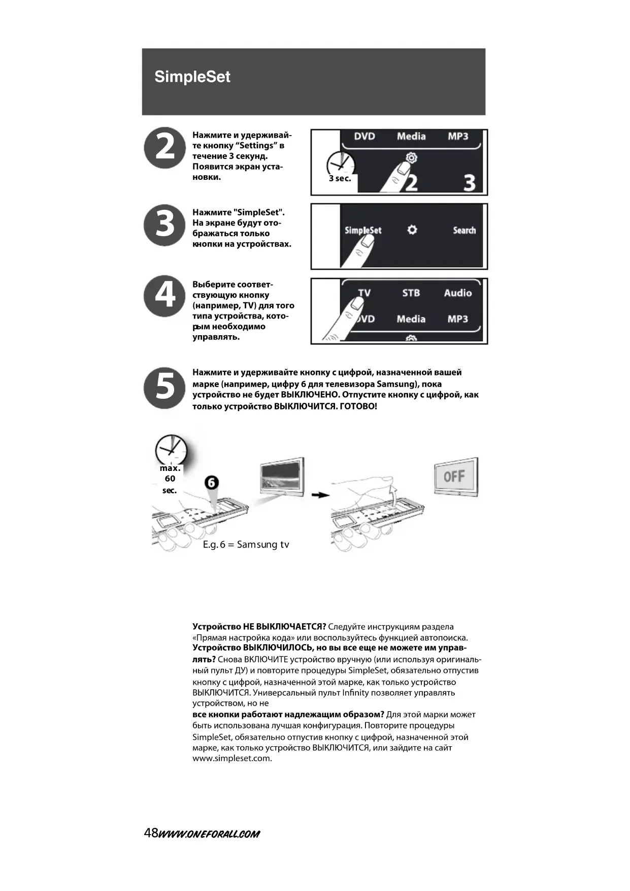 INFINITI-105x230 manual_14-talen_RDN-1230113:Infinity Manual_gedrukt 23-01-13 11:21 Pagina 4748 WWW.ONEFORALL.COM Нажмите и удерживайте кнопку с цифрой, назначенной вашеймарке (например, цифру 6 для телевизора Samsung), покаустройство не будет ВЫКЛЮЧЕНО. Отпустите кнопку с цифрой, кактолько устройство ВЫКЛЮЧИТСЯ. ГОТОВО!Устройство НЕ ВЫКЛЮЧАЕТСЯ? Следуйте инструкциям раздела«Прямая настройка кода» или воспользуйтесь функцией автопоиска.Устройство ВЫКЛЮЧИЛОСЬ, но вы все еще не можете им управ-лять? Снова ВКЛЮЧИТЕ устройство вручную (или используя оригиналь-ный пульт ДУ) и повторите процедуры SimpleSet, обязательно отпустивкнопку с цифрой, назначенной этой марке, как только устройствоВЫКЛЮЧИТСЯ. Универсальный пульт Infinity позволяет управлятьустройством, но невсе кнопки работают надлежащим образом? Для этой марки можетбыть использована лучшая конфигурация. Повторите процедурыSimpleSet, обязательно отпустив кнопку с цифрой, назначенной этоймарке, как только устройство ВЫКЛЮЧИТСЯ, или зайдите на сайтwww.simpleset.com.Нажмите и удерживай- т е кнопку “Settings” втечение 3 секунд. П оявится экран уста-новки. Н ажмите "SimpleSet".На экране будут ото-бражаться только к нопки на устройствах.Выберите соответ- с твующую кнопку(например, TV) для тоготипа устройства, кото- р ым необходимоуправлять. 2