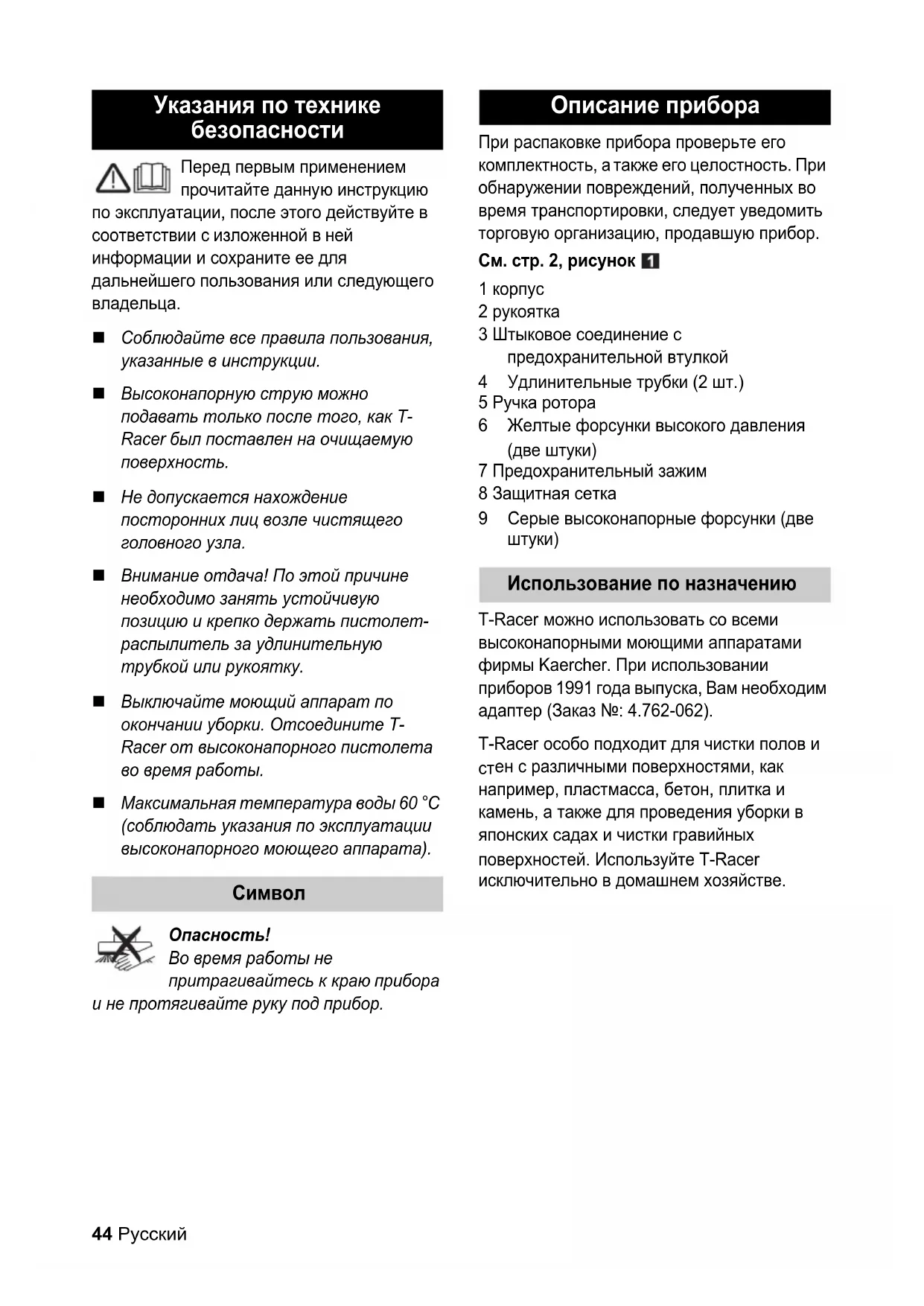 T-Racer можно использовать со всеми высоконапорными моющими аппаратами фирмы Kaercher. При использовании приборов 1991 года выпуска, Вам необходим адаптер (Заказ №: 4.762-062). T-Racer особо подходит для чис тки полов и