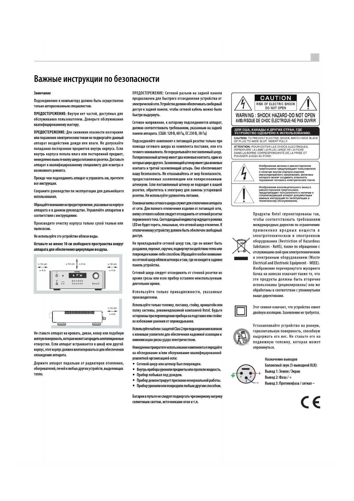 Не прокладывайте сетевой шнур там, где он может быть раздавлен, пережат, скручен, подвергнут воздействию тепла или поврежден каким-либо способом. Обращайте особое внимание на сетевой шнур вблизи штекера и там, где он входит в заднюю панель устройства. Сетевой шнур следует отсоединять от стенной розетки во время грозы или если прибор оставлен неиспользуемым длительное время. Используйте только принадлежности, указанные производителем. Используйте только тележку, поставку, стойку, кронштейн или полку системы, рекомендованной компанией Rotel. Будьте осторожны при перемещении прибора на подставке или стойке во избежание ранения от опрокидывания. Используйте кабели с защитой Class 2 при подсоединении колонок к клеммам усилителя для обеспечения надежной изоляции и минимизации риска удара электричеством. Немедленно прекратите использование компонента и передайте на обследование и/или обслуживание квалифицированной ремонтной организацией если: