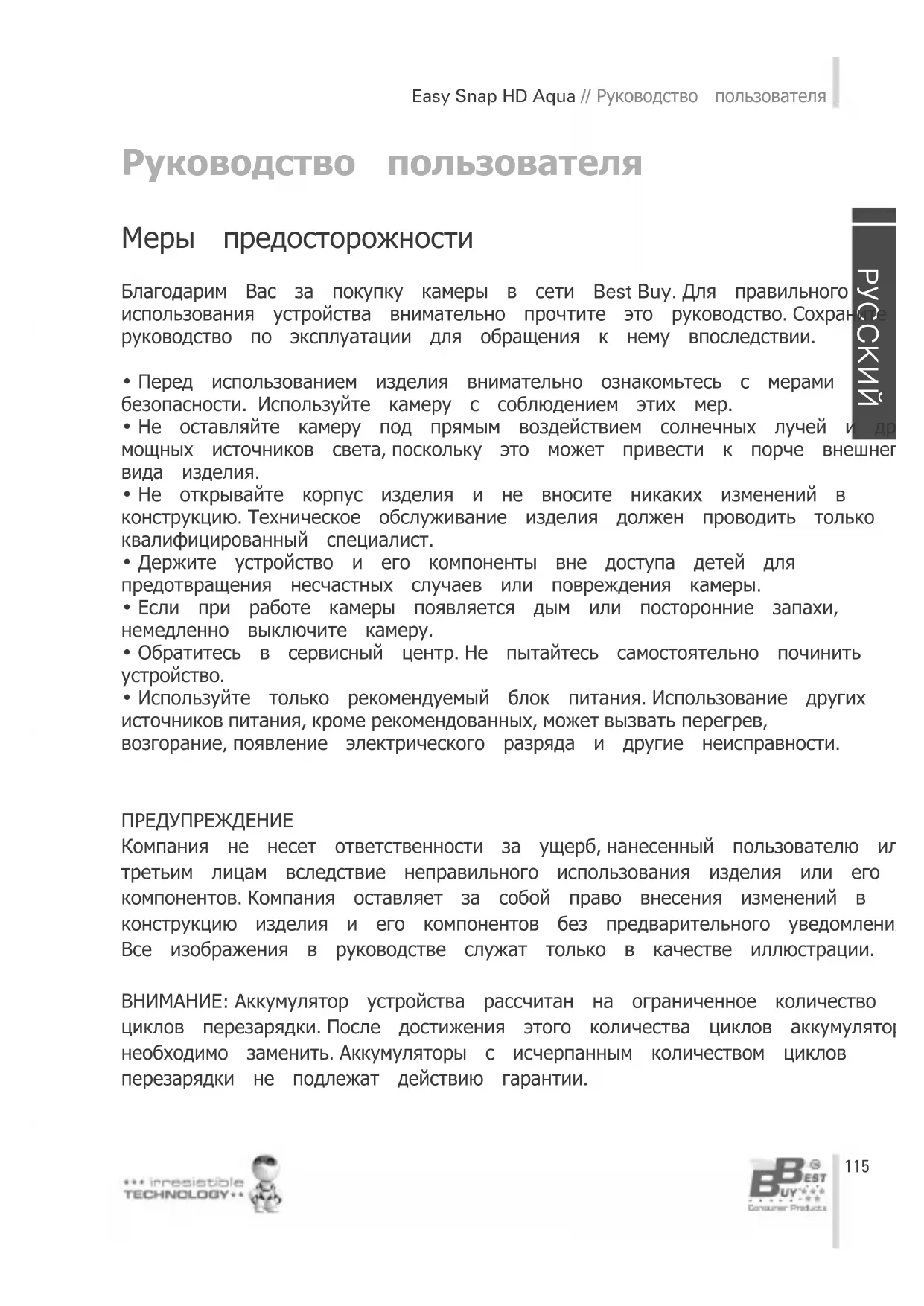 Руководство пользователя Меры предосторожности Благодарим Вас за покупку камеры в сети Best Buy. Для правильного использования устройства внимательно прочтите это руководство. Сохраните руководство по эксплуатации для обращения к нему впоследствии.