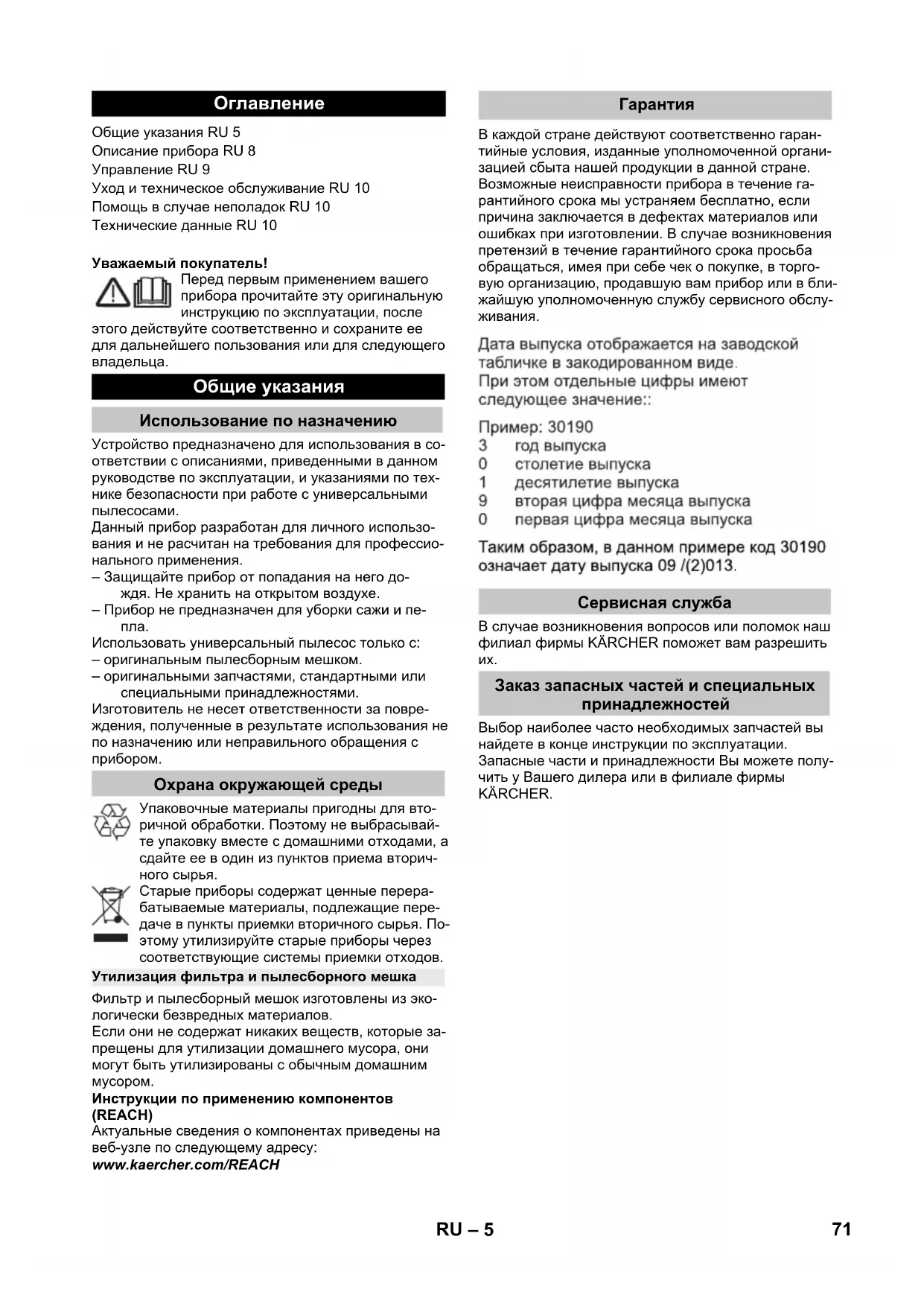 Общие указания RU 5 Описание прибора RU 8 Управление RU 9 Уход и техническое обслуживание RU 10 Помощь в случае неполадок RU 10 Технические данные RU 10 Общие указания Использование по назначению Охрана окружающей среды Утилизация фильтра и пылесборного мешка