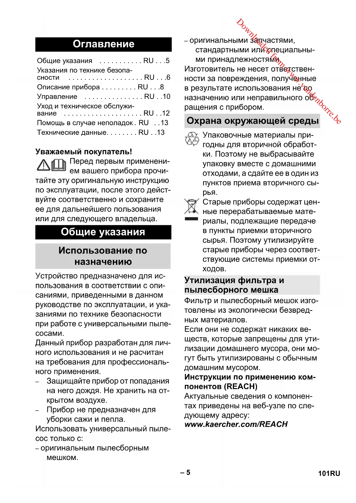 Фильтр и пылесборный мешок изго- товлены из экологически безвред- ных материалов. Если они не содержат никаких ве- ществ, которые запрещены для ути- лизации домашнего мусора, они мо- гут быть утилизированы с обычным домашним мусором. Инструкции по применению ком- понентов (REACH) Актуальные сведения о компонен- тах приведены на веб-узле по сле- дующему адресу: www.kaercher.com/REACH
