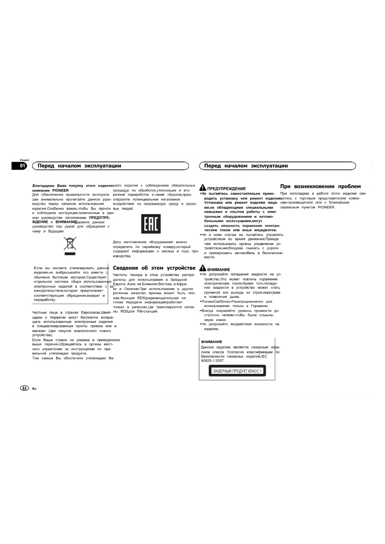 нему в будущем. Если вы желаете утилизировать данноеизделие, не выбрасывайте его вместе собычным бытовым мусором. Существуетотдельная система сбора использованныхэлектронных изделий в соответствии с за-конодательством, которая предполагаетсоответствующее обращение, возврат ипереработку.Частные лица в странах Евросоюза, Швей-царии и Норвегии могут бесплатно возвра-щать использованные электронные изделияв специализированные пункты приема или вмагазин (при покупке аналогичного новогоустройства).Если Ваша страна не указана в приведенномвыше перечне, обращайтесь в органы мест-ного управления за инструкциями по пра-вильной утилизации продукта.Тем самым Вы обеспечите утилизацию Ва-шего изделия с соблюдением обязательныхпроцедур по обработке, утилизации и вто-ричной переработке и, таким образом, пред-отвратите потенциальное негативноевоздействие на окружающую среду и здоро-вье людей.Дату изготовления оборудования можноопределить по серийному номеру, которыйсодержит информацию о месяце и годе про-изводства. Сведения об этом устройстве Частоты тюнера в этом устройстве распре-делены для использования в Западной Европе, Азии, на Ближнем Востоке, в Афри- ке и Океании. При использовании в другихрегионах качество приема может быть пло-хим. Функция RDS (радиовещательная си-стема передачи информации) работаеттолько в регионах, где транслируются сигна-лы RDS для FM-станций. ПРЕДУПРЕЖДЕНИЕ ! Не пытайтесь самостоятельно произ-водить установку или ремонт изделия.Установка или ремонт изделия лица-ми, не обладающими специальныминавыками и опытом работы с элек-тронным оборудованием и автомо-бильными аксессуарами, могутсоздать опасность поражения электри-ческим током или иных инцидентов.! Ни в коем случае не пытайтесь управлятьустройством во время движения. Преждечем использовать органы управления ус-тройством, необходимо съехать с дорогии припарковать автомобиль в безопасномместе. ВНИМАНИЕ ! Не допускайте попадания жидкости на ус-тройство. Это может повлечь поражениеэлектрическим током. Кроме того, попада-ние жидкости в устройство может статьпричиной его выхода из строя, перегреваи появления дыма.! Pioneer CarStereo-Pass предназначен дляиспользования только в Германии.! Всегда сохраняйте уровень громкости до-статочно низким, чтобы были слышнызвуки извне.! Не допускайте воздействия влажности наизделие.ВНИМАНИЕДанное изделие является лазерным изде-лием класса 1 согласно классификации поБезопасности лазерных изделий, IEC60825-1:2007. ЛАЗЕРНЫЙ ПРОДУКТ КЛАСС 1