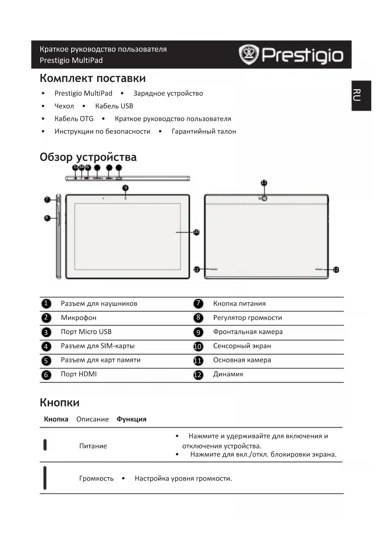 - Нажмитедлявкл./откл.блокировкиэкрана. Громкость • Настройкауровнягромкости.RU Краткое руководство пользователя Prestigio MultiPad