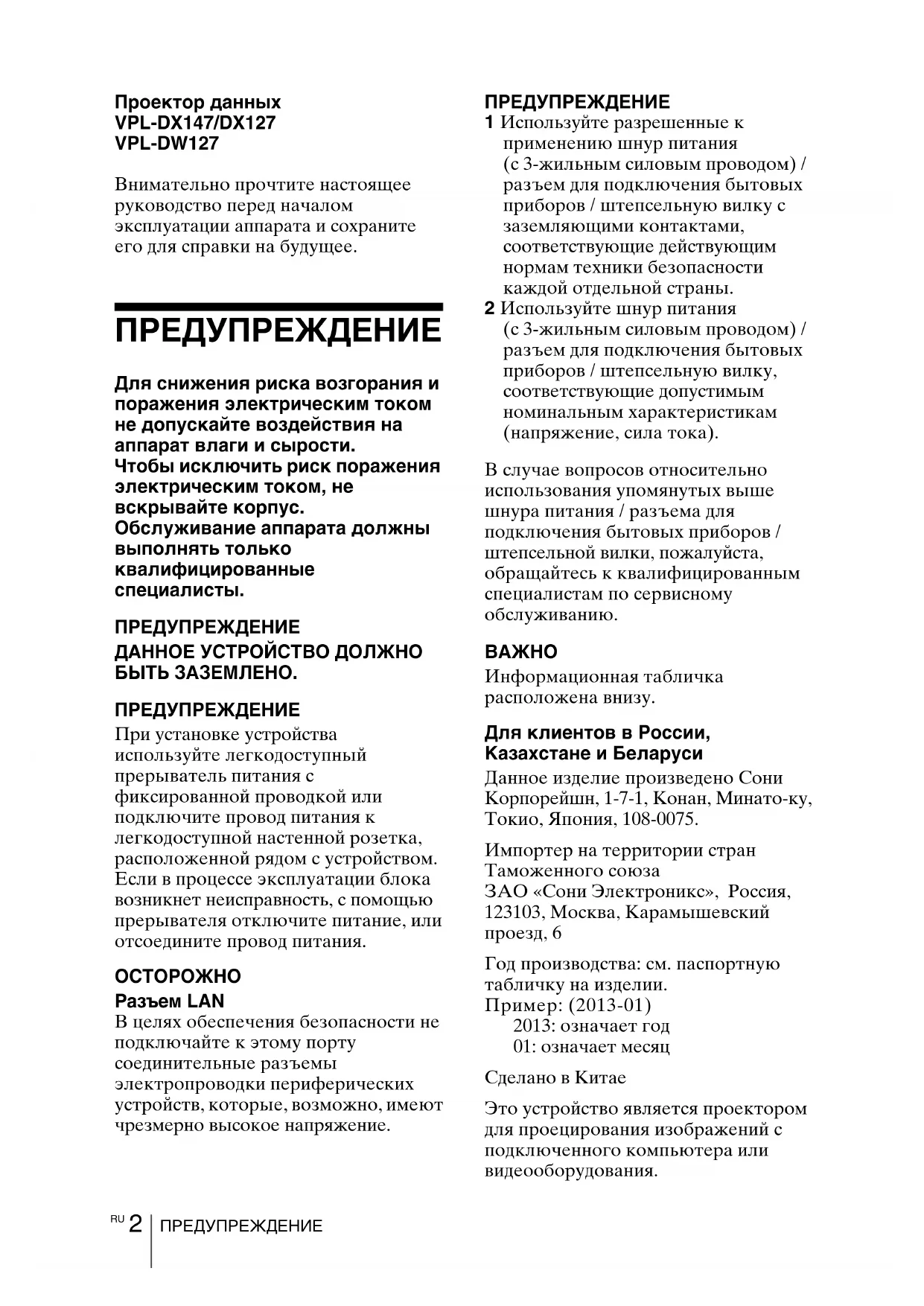 РУКОВОДСТВО ПОЛЬЗОВАТЕЛЯ VPLDW127 SONY