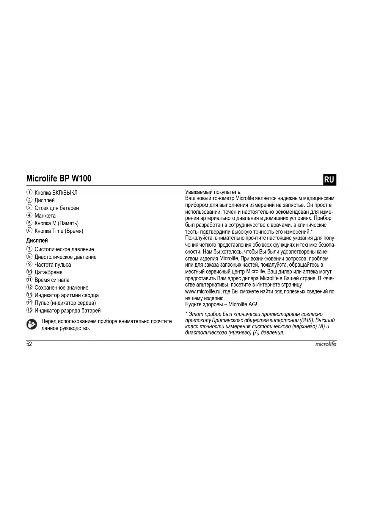 Перед использованием прибора внимательно прочтите данное руководство. Уважаемый покупатель, Ваш новый тонометр Microlife является надежным медицинским прибором для выполнения измерений на запястье. Он прост в использовании, точен и настоятельно рекомендован для изме- рения артериального давления в домашних условиях. Прибор был разработан в сотрудничестве с врачами, а клинические тесты подтвердили высокую точность его измерений.* Пожалуйста, внимательно прочтите настоящие указания для полу- чения четкого представления обо всех функциях и технике безопа- сности. Нам бы хотелось, чтобы Вы были удовлетворены каче- ством изделия Microlife . При возникновении вопросов, проблем или для заказа запасных частей, пожалуйста, обращайтесь в местный сервисный центр Microlife . Ваш дилер или аптека могут предоставить Вам адрес дилера Microlife в Вашей стране. В каче- стве альтернативы, посетите в Интернете страницу www.microlife.ru, где Вы сможете найти ряд полезных сведений по нашему изделию. Будьте здоровы – Microlife AG!