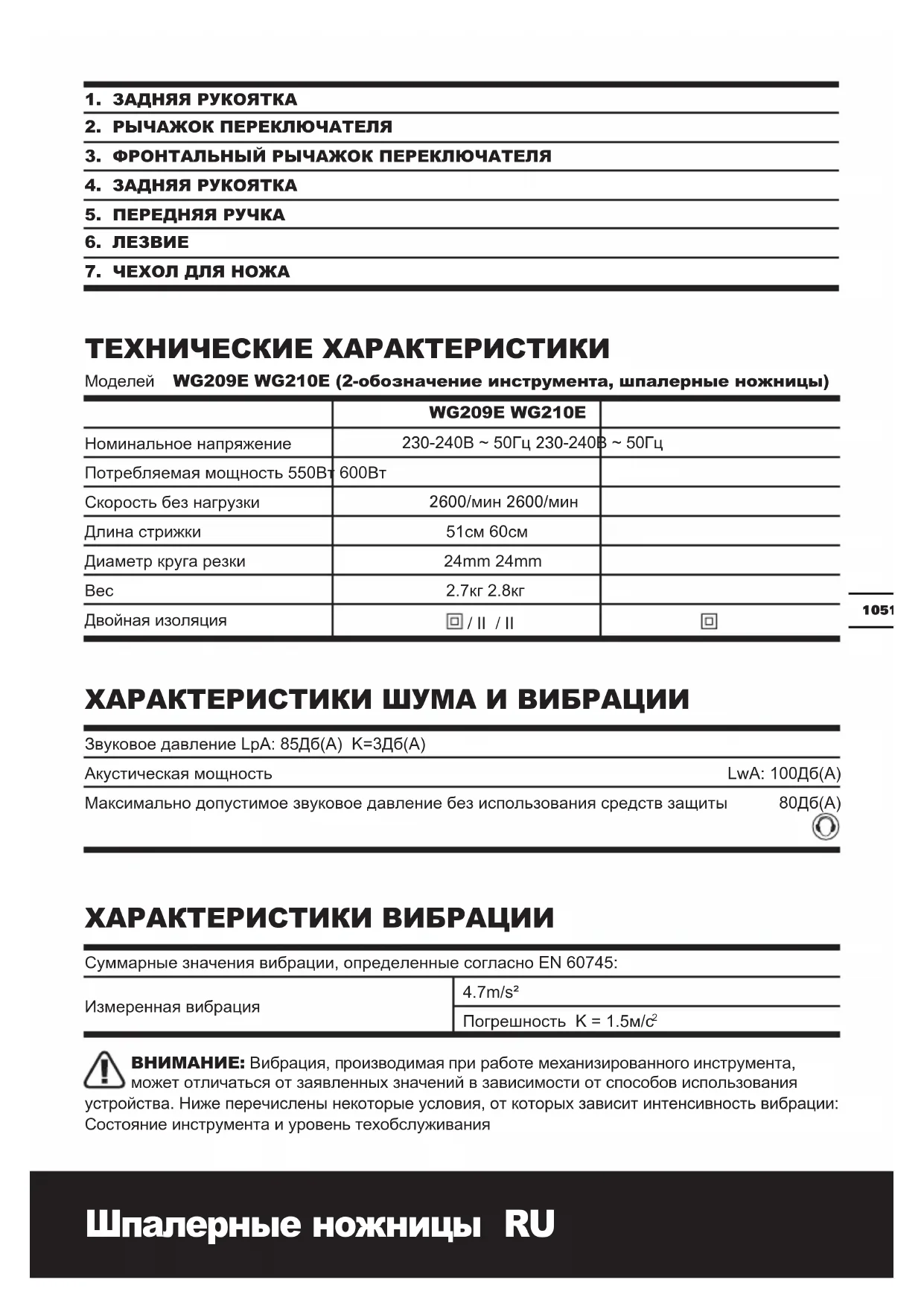 Моделей WG209E WG210E (2-обозначение инструмента, шпалерные ножницы)
