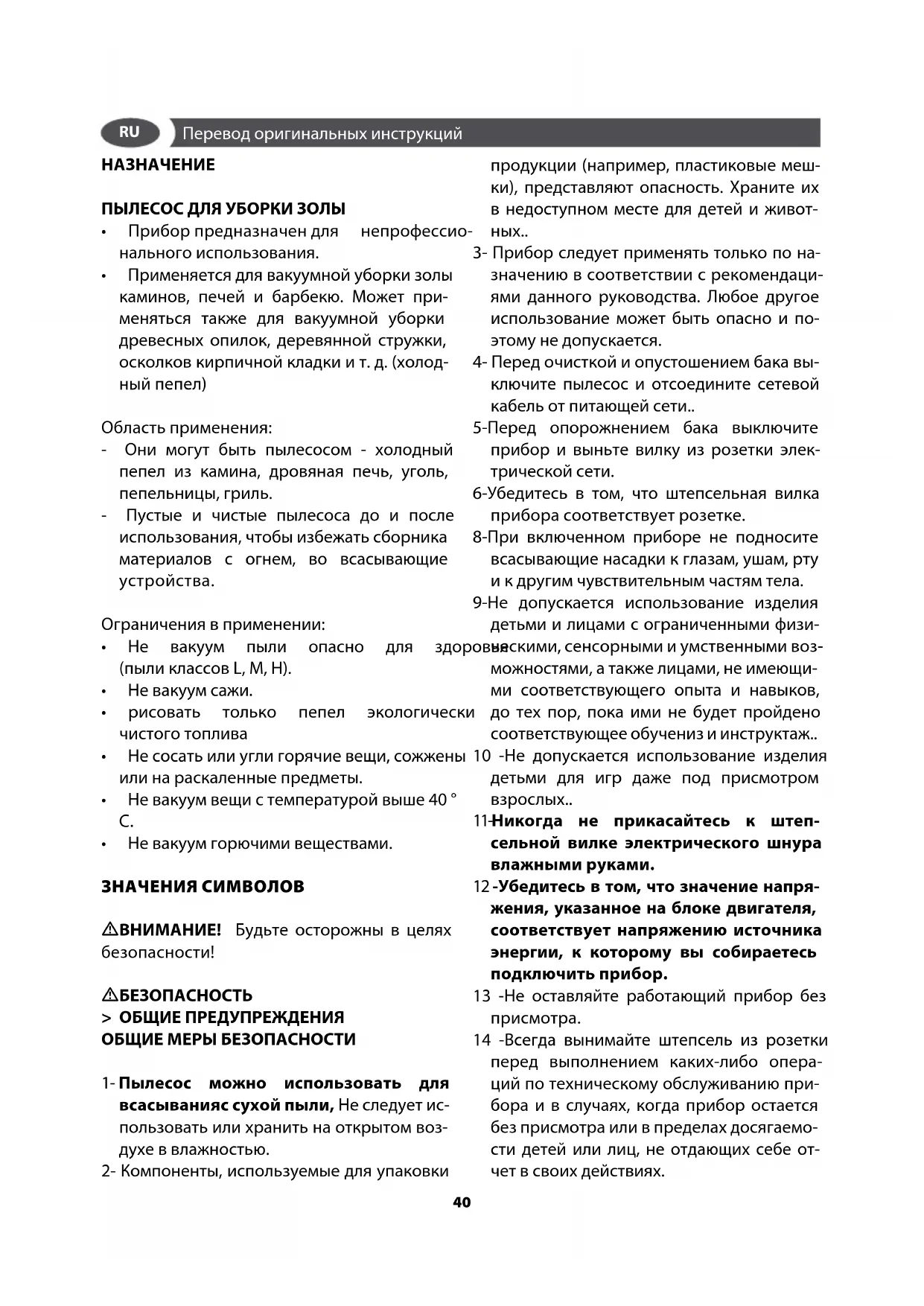 ключите пылесос и отсоедините сетевой кабель от питающей сети.. 5-Перед опорожнением бака выключите прибор и выньте вилку из розетки элек- трической сети. 6-Убедитесь в том, что штепсельная вилка прибора соответствует розетке. 8-При включенном приборе не подносите всасывающие насадки к глазам, ушам, рту и к другим чувствительным частям тела. 9-Не допускается использование изделия детьми и лицами с ограниченными физи- ческими, сенсорными и умственными воз- можностями, а также лицами, не имеющи- ми соответствующего опыта и навыков, до тех пор, пока ими не будет пройдено соответствующее обучениз и инструктаж.. 10 -Не допускается использование изделия детьми для игр даже под присмотром