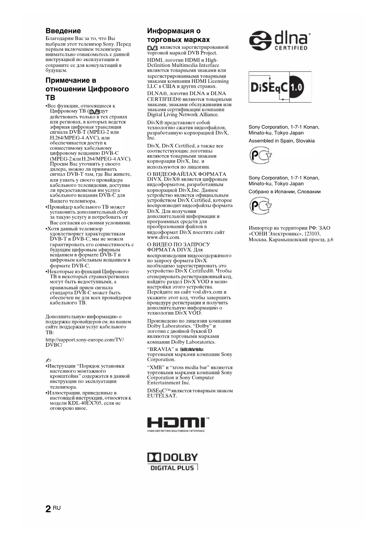 • Иллюстрации, приведенные в настоящей инструкции, относятся к модели KDL-40EX705, если не оговорено иное. Информация о торговых марках является зарегистрированной торговой маркой DVB Project. HDMI, логотип HDMI и High- Definition Multimedia Interface являются товарными знаками или зарегистрированными товарными знаками компании HDMI Licensing LLC в США и других странах. DLNA®, логотип DLNA и DLNA CERTIFIED® являются товарными знаками, знаками обслуживания или знаками сертификации компании Digital Living Network Alliance. DivX® представляет собой технологию сжатия видеофайлов, разработанную корпорацией DivX, Inc. DivX, DivX Certified, а также все соответствующие логотипы являются товарными знаками корпорации DivX, Inc. и используются по лицензии. О ВИДЕОФАЙЛАХ ФОРМАТА DIVX. DivX® является цифровым видеоформатом, разработанным корпорацией DivX,Inc. Данное устройство является официальным устройством DivX Certified, которое воспроизводит видеофайлы формата DivX. Для получения дополнительной информации и программных средств для преобразования файлов в видеоформат DivX посетите сайт www.divx.com. О ВИДЕО ПО ЗАПРОСУ ФОРМАТА DIVX. Для воспроизведения видеосодержимого по запросу формата DivX необходимо зарегистрировать это устройство DivX Certified®. Чтобы сгенерировать регистрационный код, найдите раздел DivX VOD в меню настройки этого устройства. Перейдите на сайт vod.divx.com и укажите этот код, чтобы завершить процедуру регистрации и получить дополнительную информацию о технологии DivX VOD. Произведено по лицензии компании Dolby Laboratories. “Dolby” и логотип с двойной буквой D являются торговыми марками компании Dolby Laboratories. “BRAVIA” и являются торговыми марками компании Sony Corporation. “XMB” и “xross media bar” являются торговыми марками компаний Sony Corporation и Sony Computer Entertainment Inc. DiSEqC™ является товарным знаком EUTELSAT. Sony Corporation, 1-7-1 Konan, Minato-ku, Tokyo Japan Assembled in Spain, Slovakia Sony Corporation, 1-7-1 Konan, Minato-ku, Tokyo Japan Собрано в Испании, Словакии Импортер на территории РФ: ЗАО «СОНИ Электроникс», 123103, Москва, Карамышевский проезд, д.63