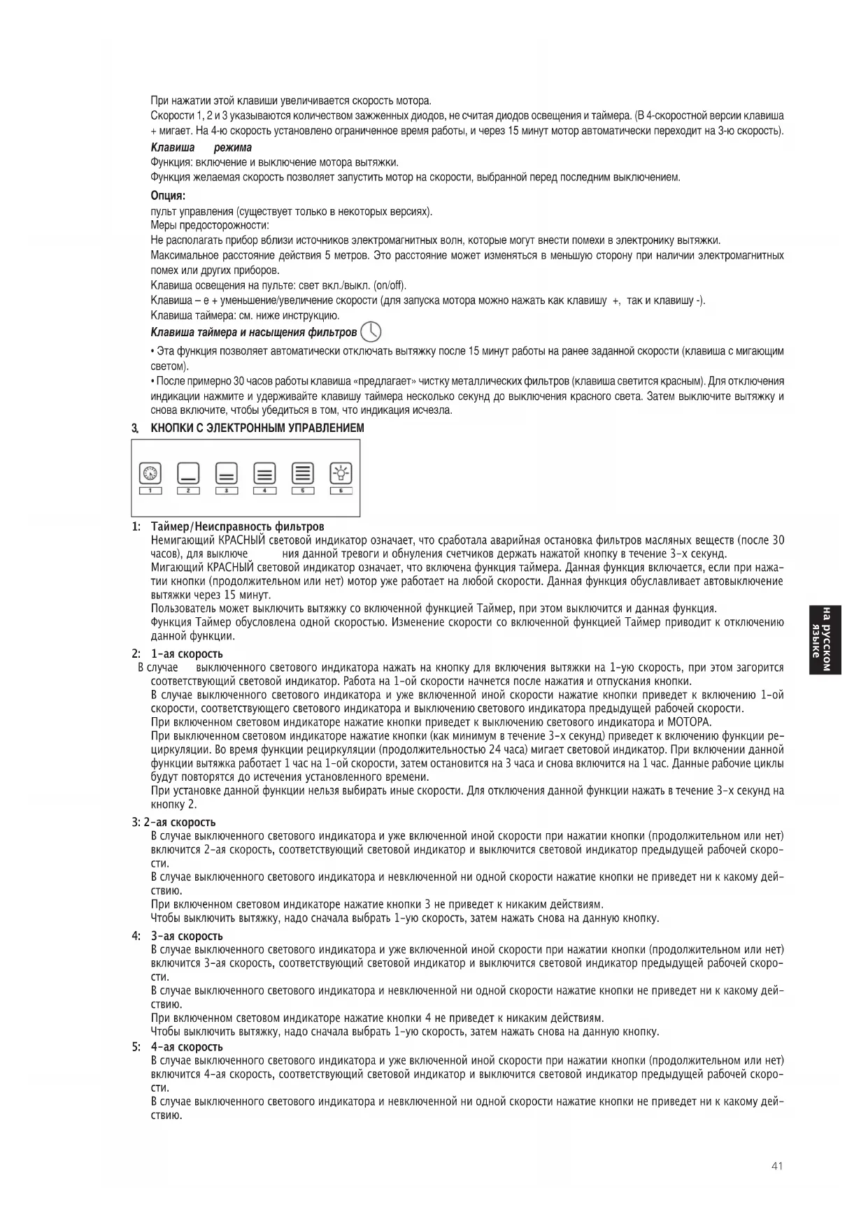 выключенного светового индикатора нажать на кнопку для включения вытяжки на 1-ую скорость, при этом загорится