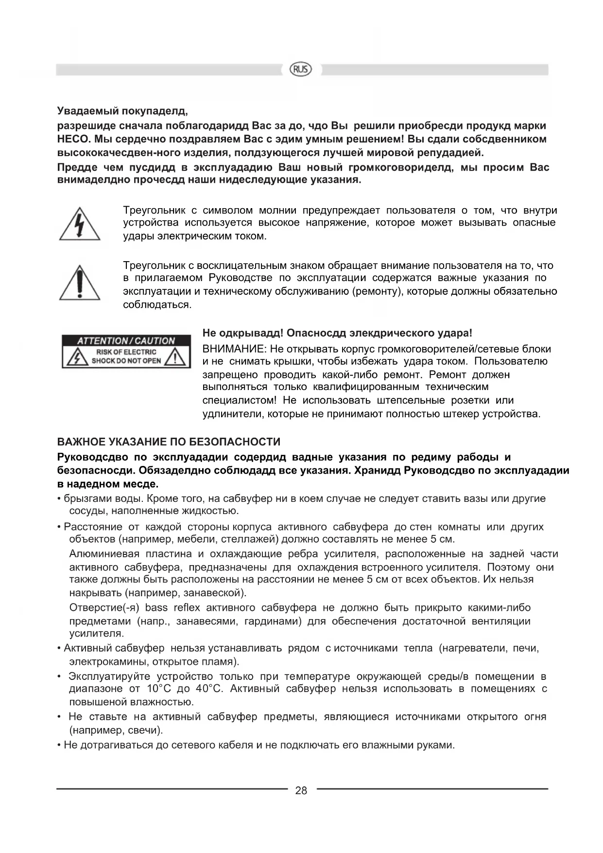 *B5T<5A34439B'"("/F , @39D3<A=;@T23 mH 3:<7<5A4@39D3<A mH7<ABR::0/@ "TBBFF FF;; )7::036`@ #RB9/03: )L%I%"&&%H''!''!&H!%!%28 RUS s}{•{€‡”„ Љ…ŽŠ{•€†• ‹{‚‹€’ƒ•€Œˆ{‘{†{Љ|†{~‰•{‹ƒ••b{Œ‚{•‰‘•‰b” ‹€’ƒ†ƒŠ‹ƒ‰|‹€Œ•ƒŠ‹‰•Ž…•‡{‹…ƒ "l”Œ€‹•€‘ˆ‰Š‰‚•‹{}†˜€‡b{ŒŒ–•ƒ‡Ž‡ˆ”‡‹€’€ˆƒ€‡b”Œ•{†ƒŒ‰|Œ•}€ˆˆƒ…‰‡ }”Œ‰…‰…{‘€Œ•}€ˆˆ‰~‰ƒ‚•€†ƒ˜Š‰†•‚Ž—“€~‰Œ˜†Ž‘’€„‡ƒ‹‰}‰„‹€ŠŽ•{•ƒ€„ o‹€••€ ‘€‡ ŠŽŒ•ƒ•• } –…ŒŠ†Ž{•{•ƒ— b{’ ˆ‰}”„ ~‹‰‡…‰~‰}‰‹ƒ•€†• ‡” Š‹‰Œƒ‡ b{Œ }ˆƒ‡{•€†•ˆ‰Š‹‰‘€Œ••ˆ{’ƒˆƒ•€Œ†€•Ž—“ƒ€Ž…{‚{ˆƒ˜ Треугольник с символом молнии предупреждает пользователя о том, что внутри устройства используется высокое напряжение, которое может вызывать опасные удары электрическим током. Треугольник с восклицательным знаком обращает внимание пользователя на то, что в прилагаемом Руководстве по эксплуатации содержатся важные указания по эксплуатации и техническому обслуживанию (ремонту), которые должны обязательно соблюдаться. m€‰•…‹”}{••nŠ{Œˆ‰Œ••–†€…•‹ƒ‘€Œ…‰~‰Ž•{‹{ ВНИМАНИЕ: Не открывать корпус громкоговорителей/сетевые блоки и не снимать крышки, чтобы избежать удара током. Пользователю запрещено проводить какой-либо ремонт. Ремонт должен выполняться только квалифицированным техническим специалистом! Не использовать штепсельные розетки или удлинители, которые не принимают полностью штекер устройства. b`fmnesj`g`mheonaegno`qmnqrh pŽ…‰}‰•Œ•}‰ Љ –…ŒŠ†Ž{•{•ƒƒ Œ‰•€‹•ƒ• }{•ˆ”€ Ž…{‚{ˆƒ˜ Љ ‹€•ƒ‡Ž ‹{|‰•” ƒ |€‚‰Š{Œˆ‰Œ•ƒn|˜‚{•€†•ˆ‰Œ‰|†—•{••}Œ€Ž…{‚{ˆƒ˜u‹{ˆƒ••pŽ…‰}‰•Œ•}‰Š‰–…ŒŠ†Ž{•{•ƒƒ }ˆ{•€•ˆ‰‡‡€Œ•€