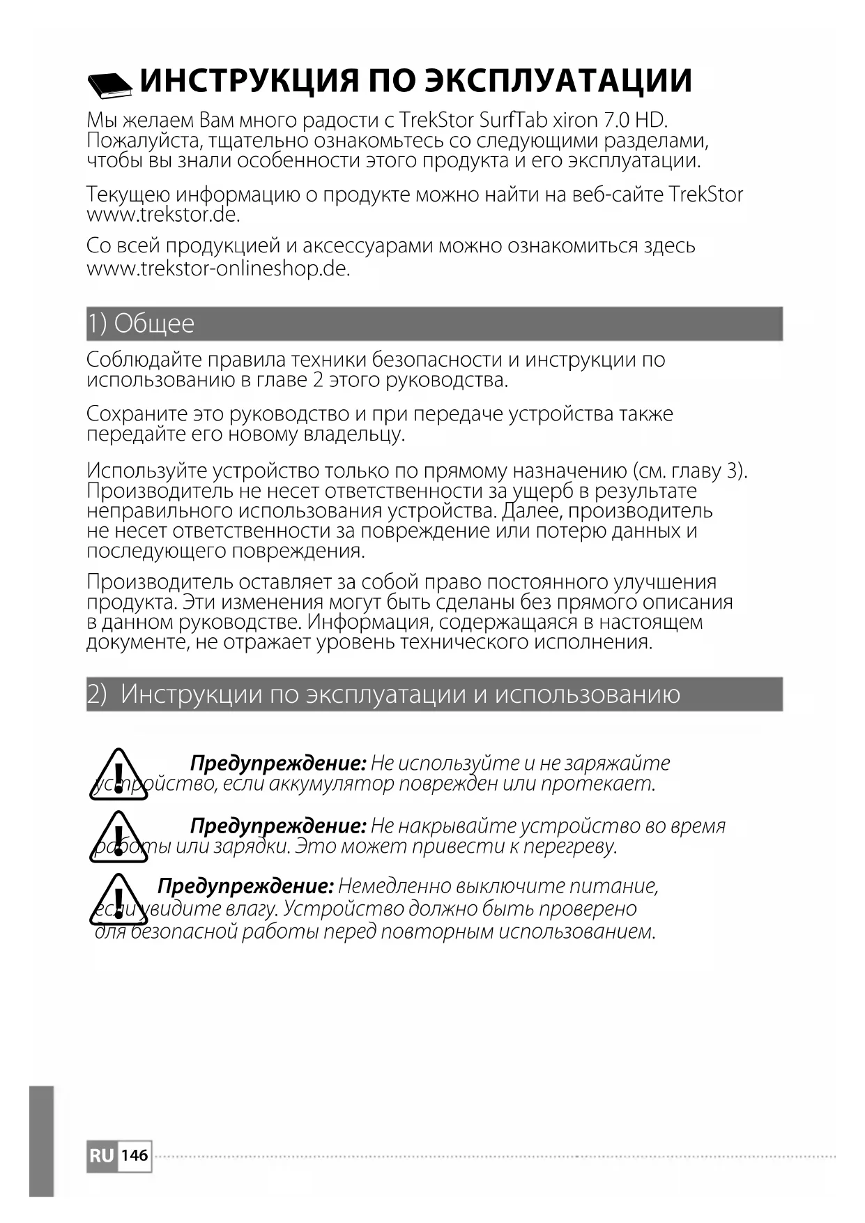 ИНСТРУКЦИЯ ПО ЭКСПЛУАТАЦИИ Мы желаем Вам много радости с TrekStor SurfTab xiron 7.0 HD. Пожалуйста, тщательно ознакомьтесь со следующими разделами, чтобы вы знали особенности этого продукта и его эксплуатации. Текущею информацию о продукте можно найти на веб-сайте TrekStor www.trekstor.de. Со всей продукцией и аксессуарами можно ознакомиться здесь www.trekstor-onlineshop.de.