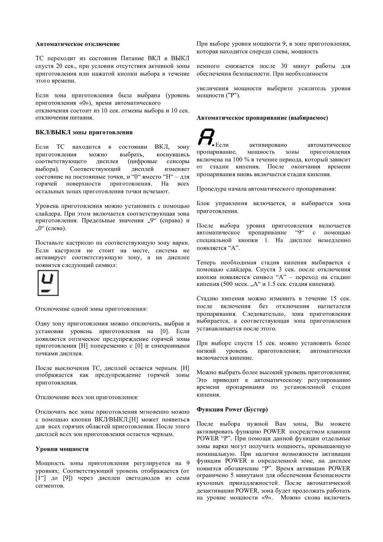 кастрюлю из зоны варки, функция POWER не бу дет