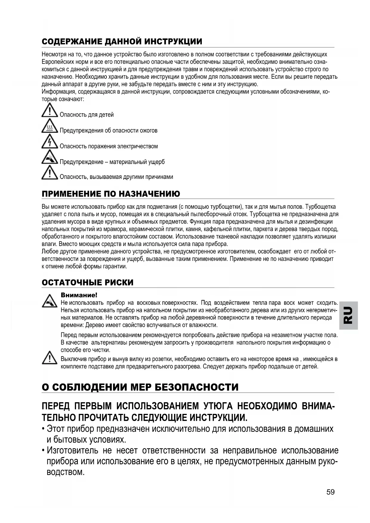 турбощетку. Опасность застревания и затягивания внутрь различных предметов. Опасность падения пы-